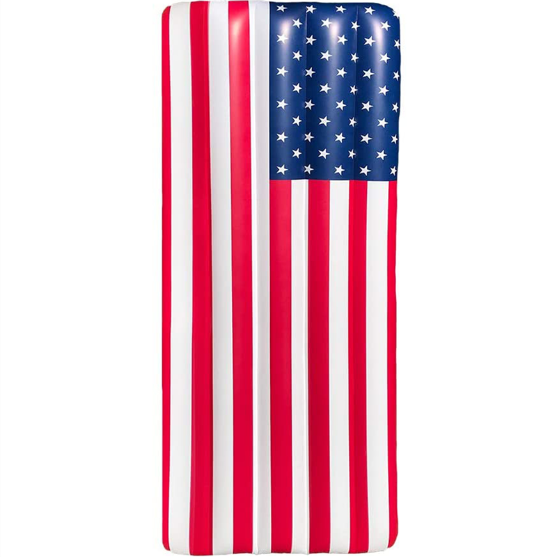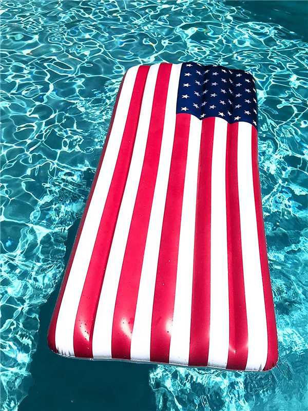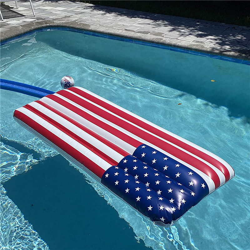 The material of this flag floating row is PVC. The foldable inflatable floating chair can be used while swimming. Perfect sealing performance. Easy to inflate or deflate. This style folds down to a small size for easy storage. You can also customize your logo.