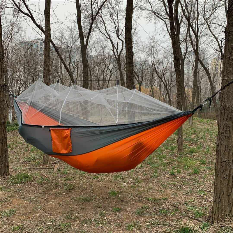 The camping outdoor hammock is made of 210T parachute fabric material. The backpacking hammock can be used for camping, travel, beach, yard. You will have everything you need for a quick and easy hanging setup. It will take less than 3 minutes to hang your camping hammock on a tree or nearby objects using the ropes, strips, and carabiners. Mosquito nets can help you avoid mosquito bites and sleep comfortably outdoors.