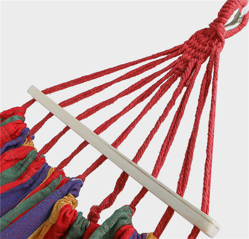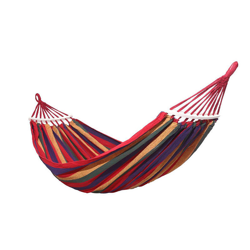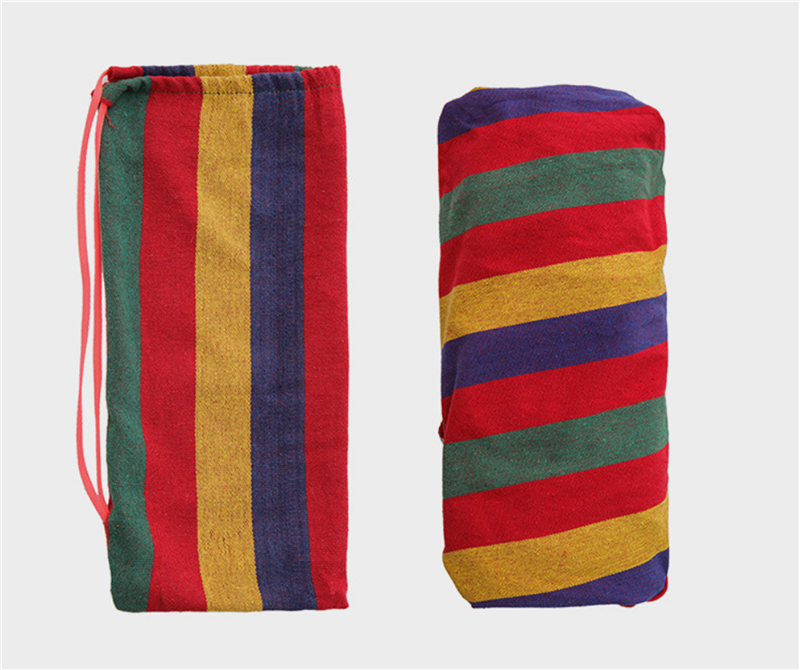 The camping outdoor hammock is made of canvas. The backpacking hammock can be used for camping, travel, beach, yard. You will have everything you need for a quick and easy hanging setup. It will take less than 3 minutes to hang your camping hammock on a tree or nearby objects using the ropes, strips, and carabiners.