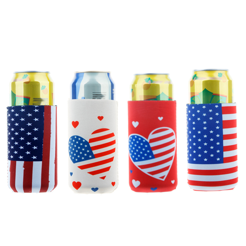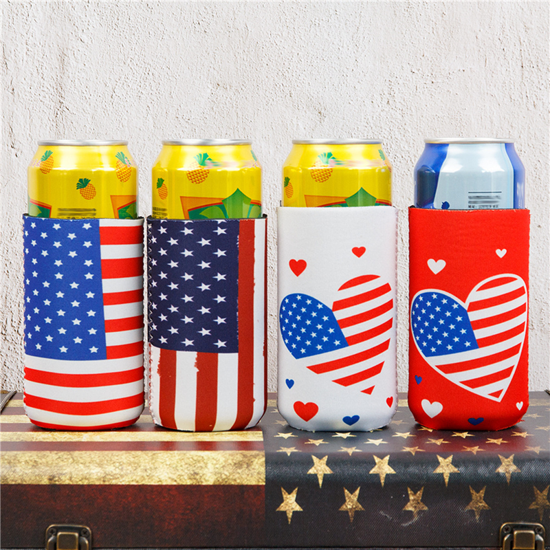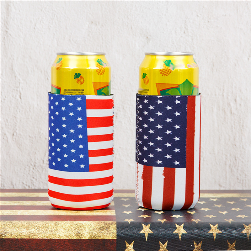 The material of this product is diving material. Keeps your drink cold. Perfect for birthday parties, weeding parties, football games, barbecues, family picnics, bachelorette parties, graduation parties and more. Printed with the national flag pattern, it is especially suitable for parties on Independence Day. Can customize your company logo and pattern
