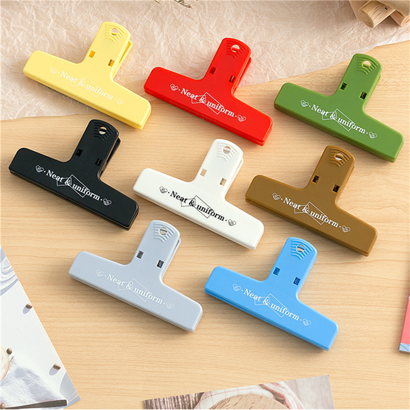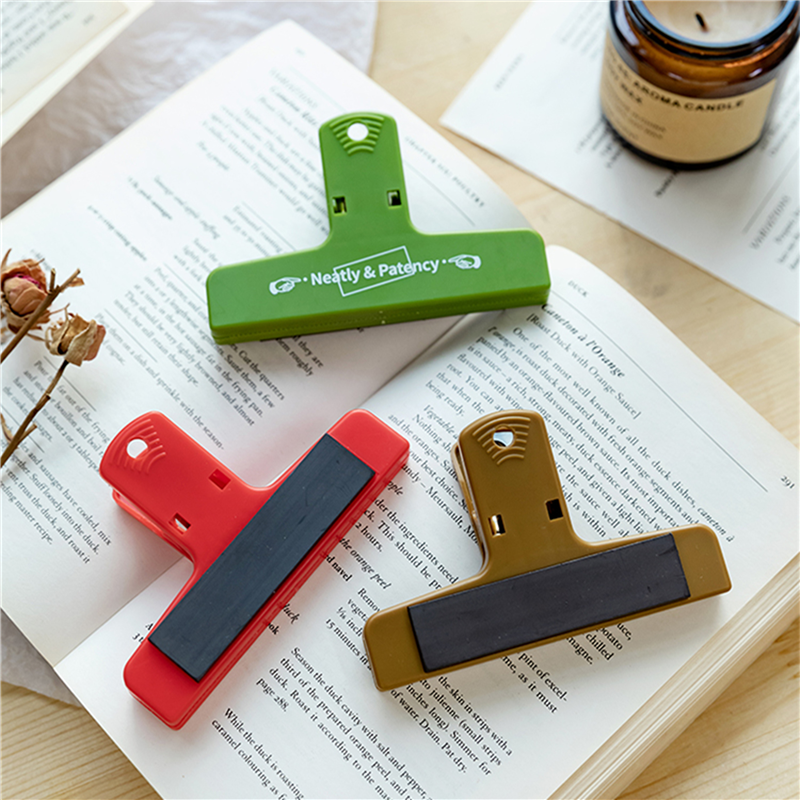 The material of this clip is plastic. There is a magnet on the back. Just the right size to organize papers together or tightly seal small grocery bags. It can perfectly print your company's logo and pattern.
