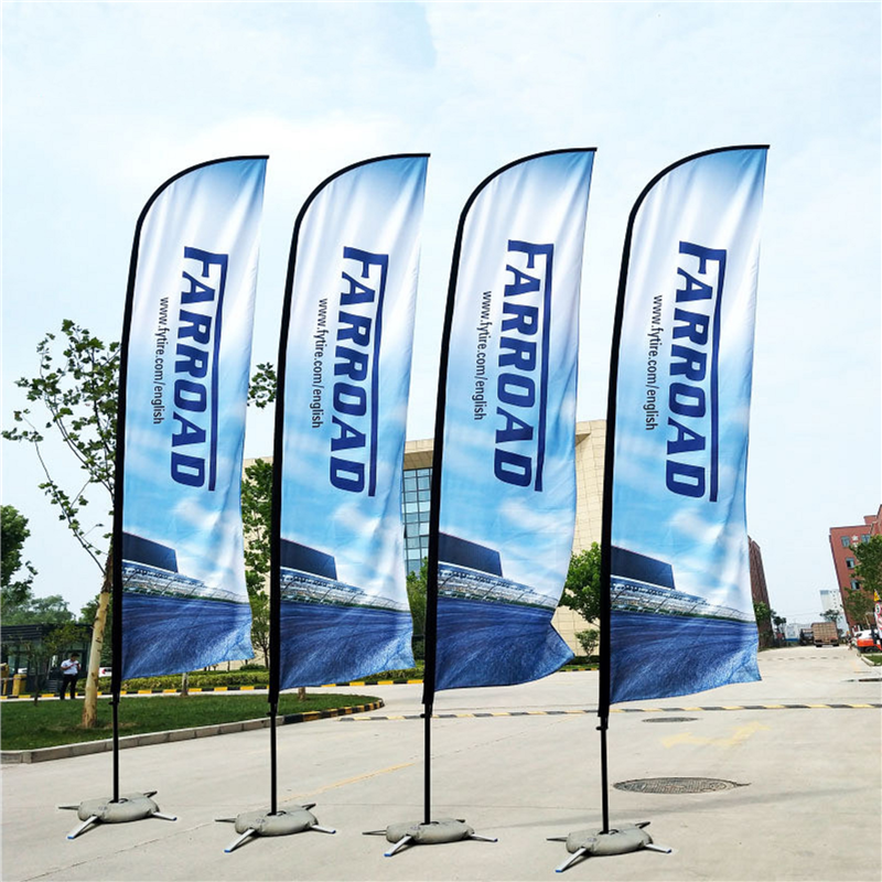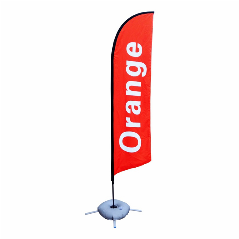 Custom digitally printed feather flag, which is perfect for corporate flags, promo flags, beach flags and retail flag advertising, easy to set up and disassemble. Each set includes a one side printed flag, a flagpole, an X-base, and a water bag.