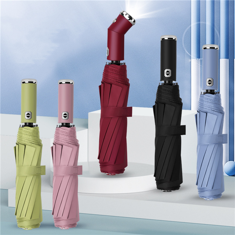 This umbrella is automatic. One button opening and closing, easy to use. The handle of the umbrella can be rotated to make it curved, and the lighting is more convenient. Can custom logo and pattern for you.