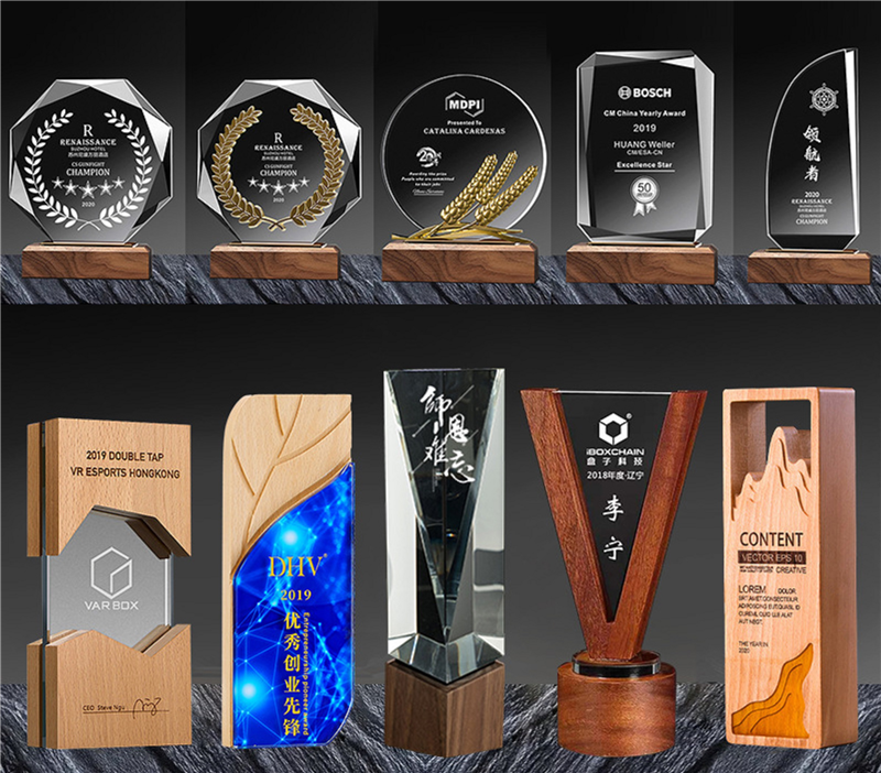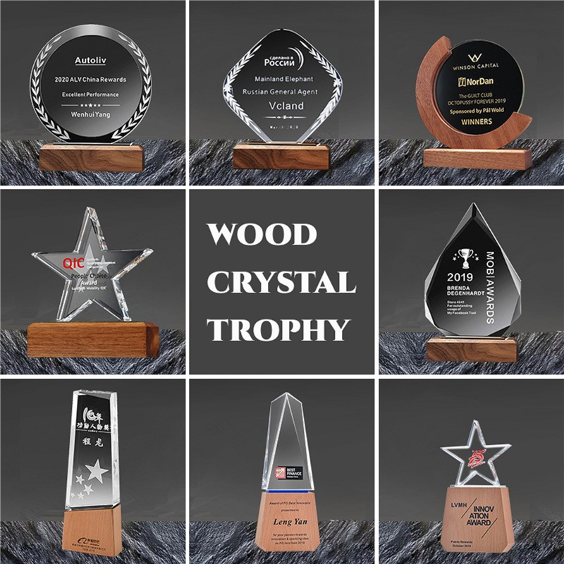 This kind of crystal trophy is transparent with wooden part, on which custom content can be carved. Gift box provided. Make your award ceremony more professional.
