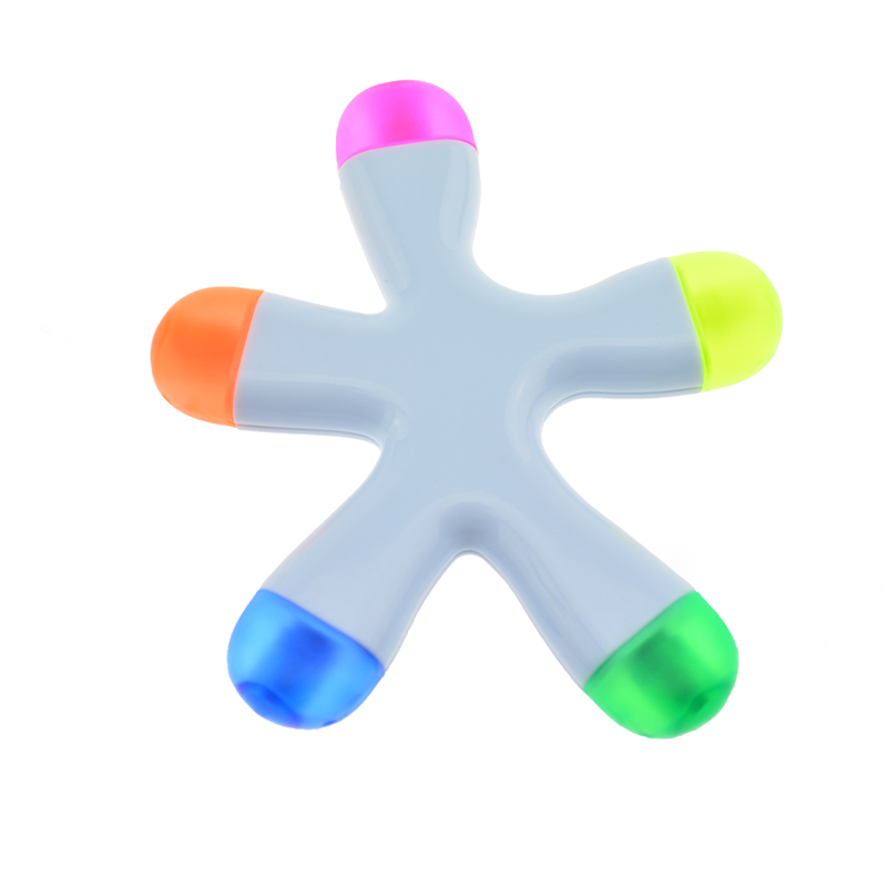 This is a five star shaped highlighter, ABS material. The five different colors are pink, yellow, orange, blue and green. Great for children use.