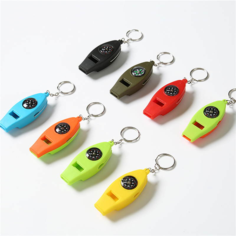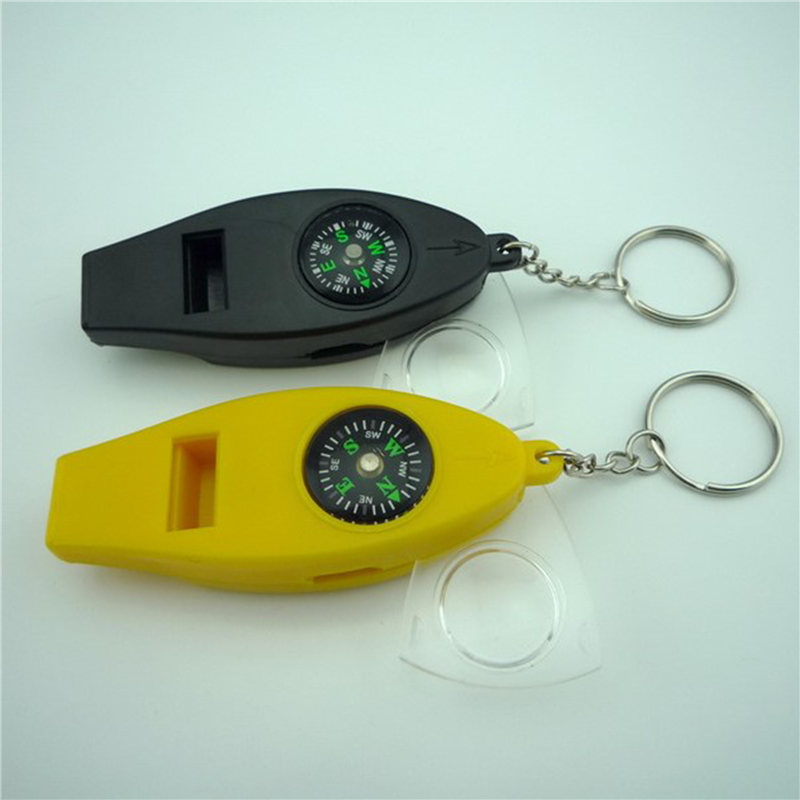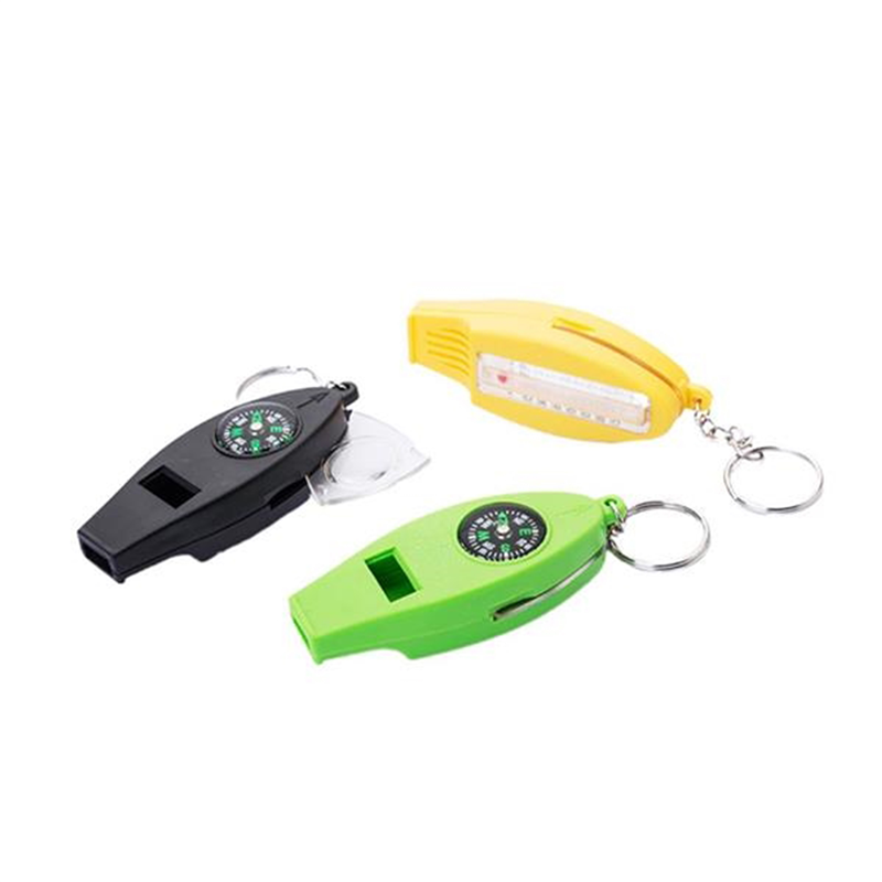 Shrill-sounding safety whistle with magnifier, compass, and two-scale thermometer. Made of ABS material, good for its solid, durable and wear-resistant, the scales of the thermometer and compass are clearly visible and easy to read. Multi-function whistle is not only lightweight but also portable, pocket size with a key ring, more convenient to carry and hard to lost, simple but practical. Can customize your logo on it.