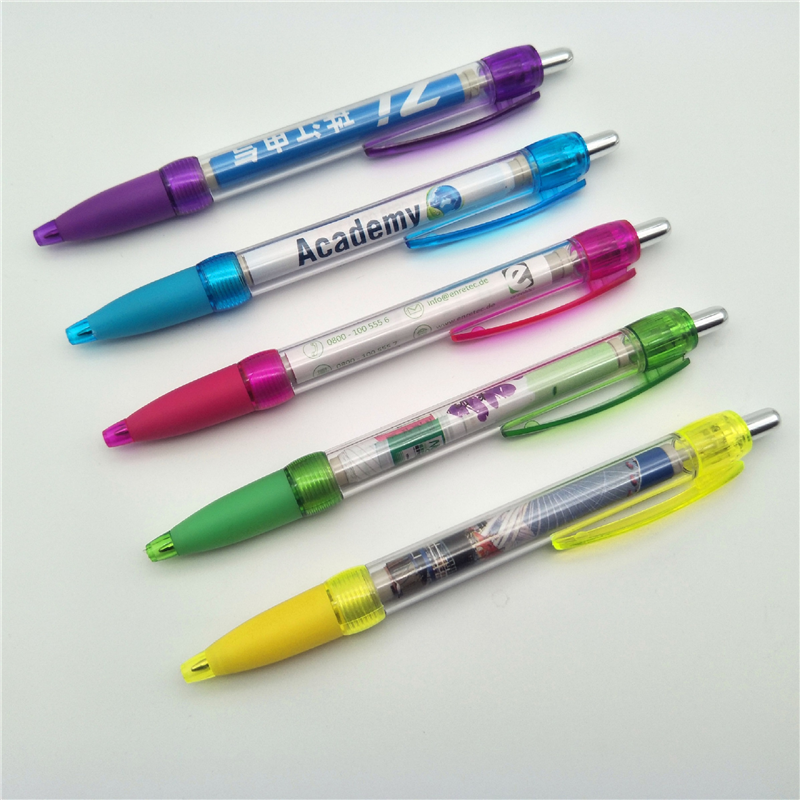 The pen is made of advanced ABS material for good use experience. Two-side full color printing on the banner sizes 7" * 2.6" inside the pen is available which can be rolled out to see the advertising. Super great for promotional events.