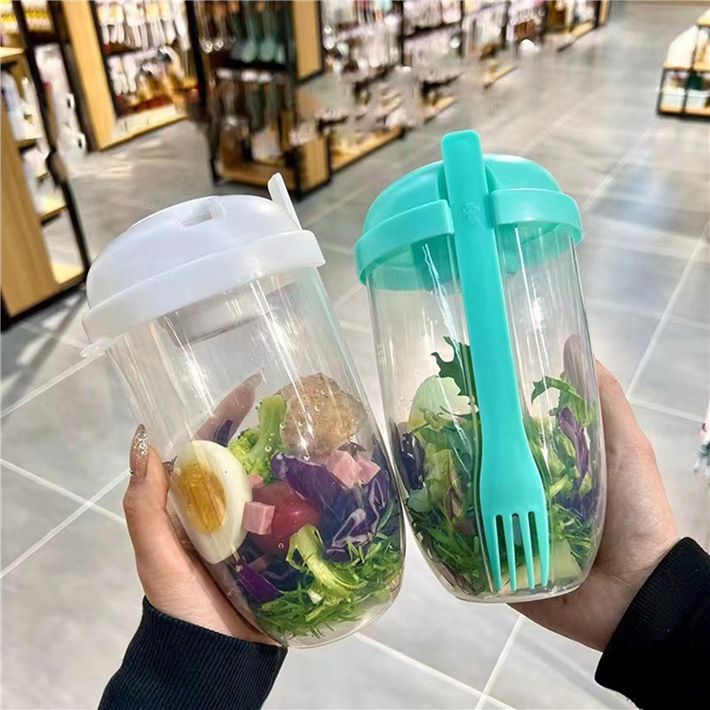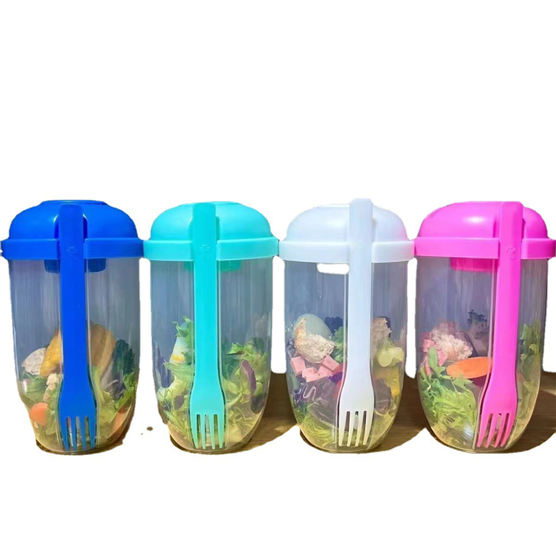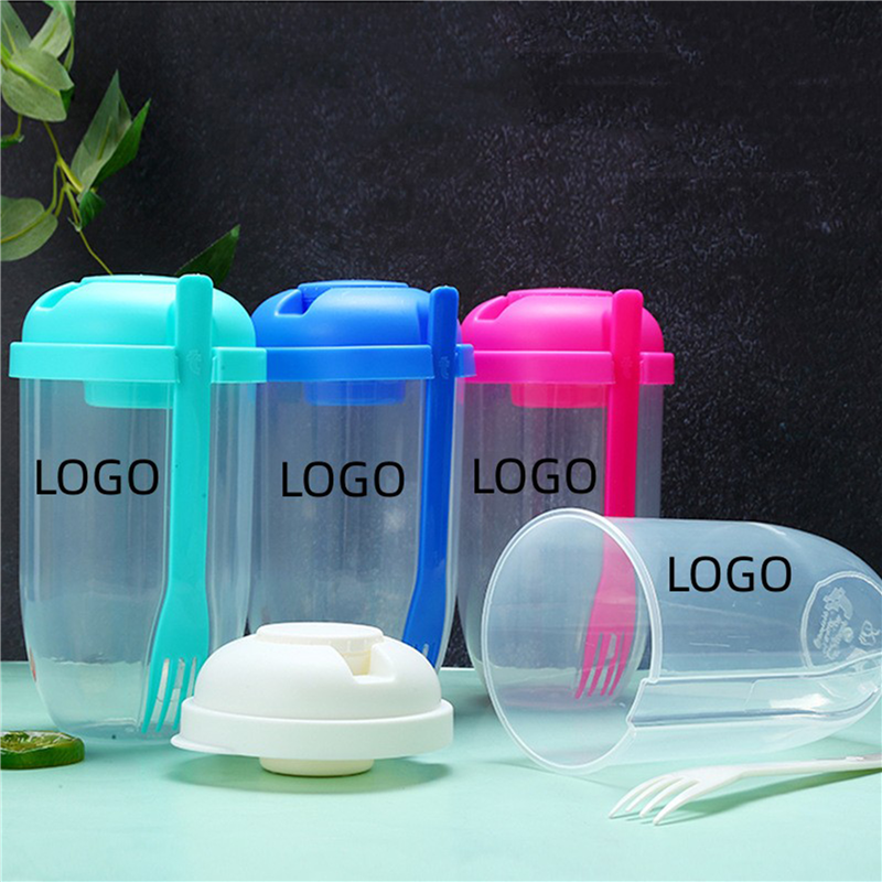 This salad shaker cup is made of food grade PP plastic, come with a lid, fork and little dressing container in the middle of the lid, very convenient to use. Perfect for schools, offices and outdoor picnics. Fits in Most Lunch bags and the easy salad container helps keep salad or fruits fresh, cool and crisp. Can customize your logo on it.