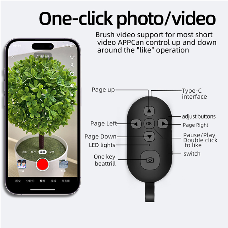 This small remote control has seven buttons, and functions includes page turning, video recording, drama chasing, taking photos, etc... Rechargeable, and equipped with Type-C cable in packing. With the silicone handle, you can carry it easily to anywhere. Three colors available and welcome to come to us if you need another color. Can customize your logo on the back shell.