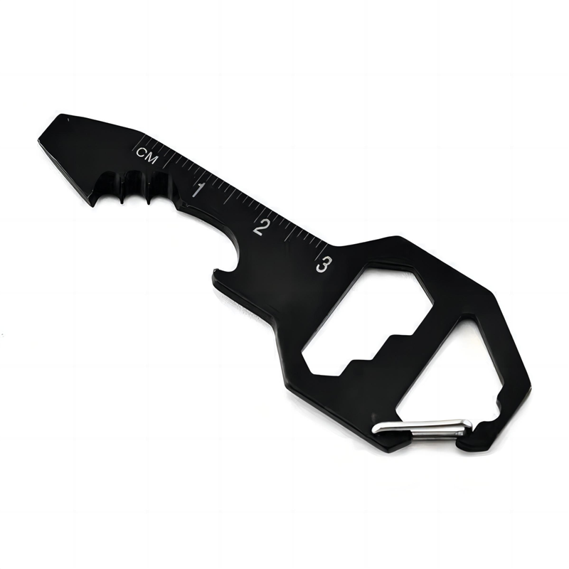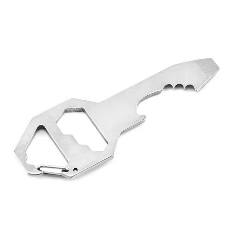 The material for opening this bottle is stainless steel. This is a multifunctional bottle opener. Includes measuring tape, screwdriver, wrench, keychain, cutter, and bottle opener. Suitable for carrying around. Can customize your logo and pattern.