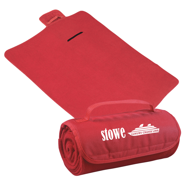 Large 48" x 53",100% Polyester Fleece. Flap Color Matches Blanket. Easily Folds Within Itself Using Hook And Loop Closure. Attached Handle For Easy Carrying. Great For Travel. Surface Washable.