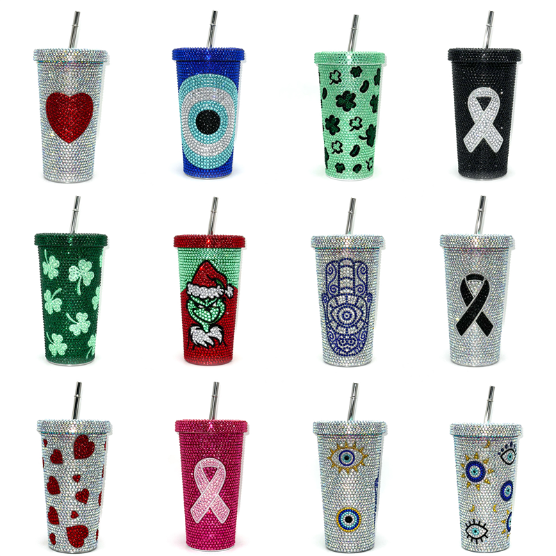 This bottle is made of high quality stainless steel, double wall design, SS 304 inside, SS 201 outside, with a straw and bling lid, can custom bling diamond pattern on the surface.