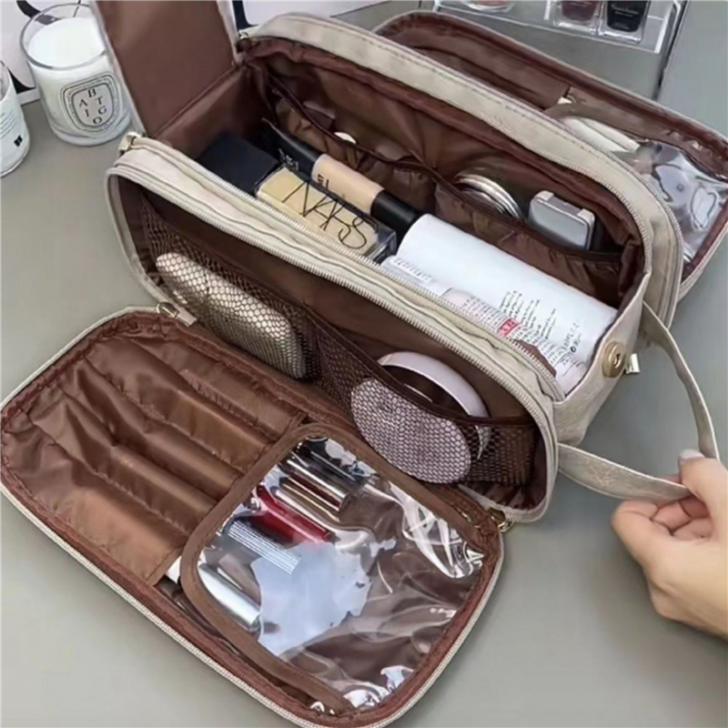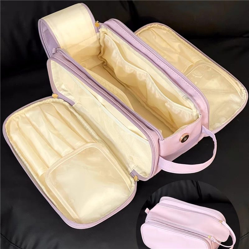 The material of this bag is PU. Waterproof material and very large capacity, it can store all the makeup bags you need. It is also very suitable for carrying when traveling. Can customize your logo and pattern.
