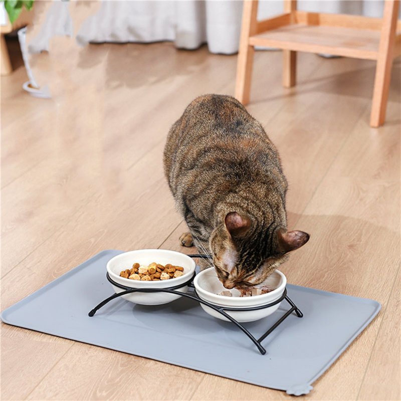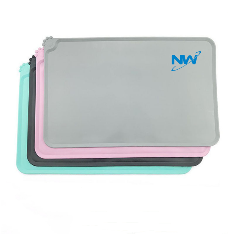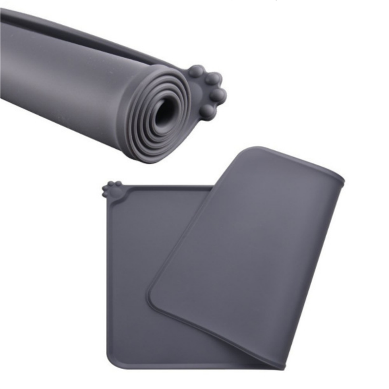 The material of this bowl mat is silicone. Wash or simply wipe the mat with a damp cloth. It dries quickly and can be cleaned with a dishwasher. The raised edges prevent food, water, and snacks from splashing onto clean floors! An excellent mat for placing bowls, feeders, water dispensers, stands, and plates for cats and dogs. Can customize your logo and pattern.