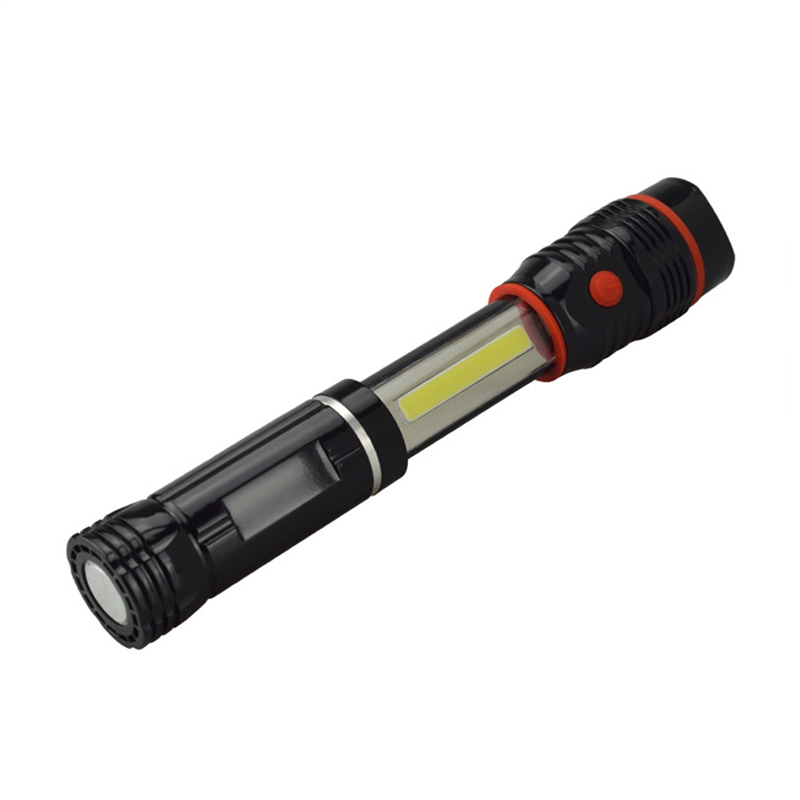 A retractable COB flashlight made of plastic ABS with a matte finish on the surface, requiring 4 AAA batteries. The bottom of the flashlight is equipped with strong magnetism, and the head light is controlled by a switch. There are three levels: strong, weak, and flashing. The COB light is controlled by extension and retraction. When opened, the product COB automatically lights up, and when retracted, the COB light goes out.
