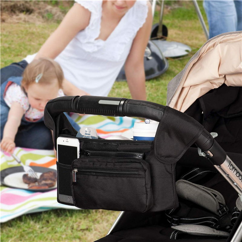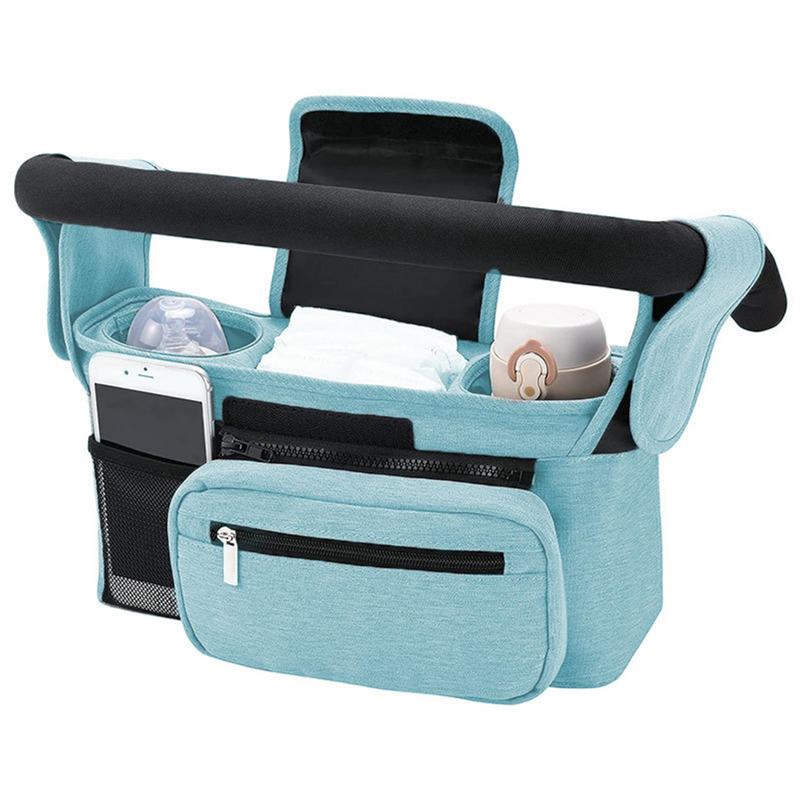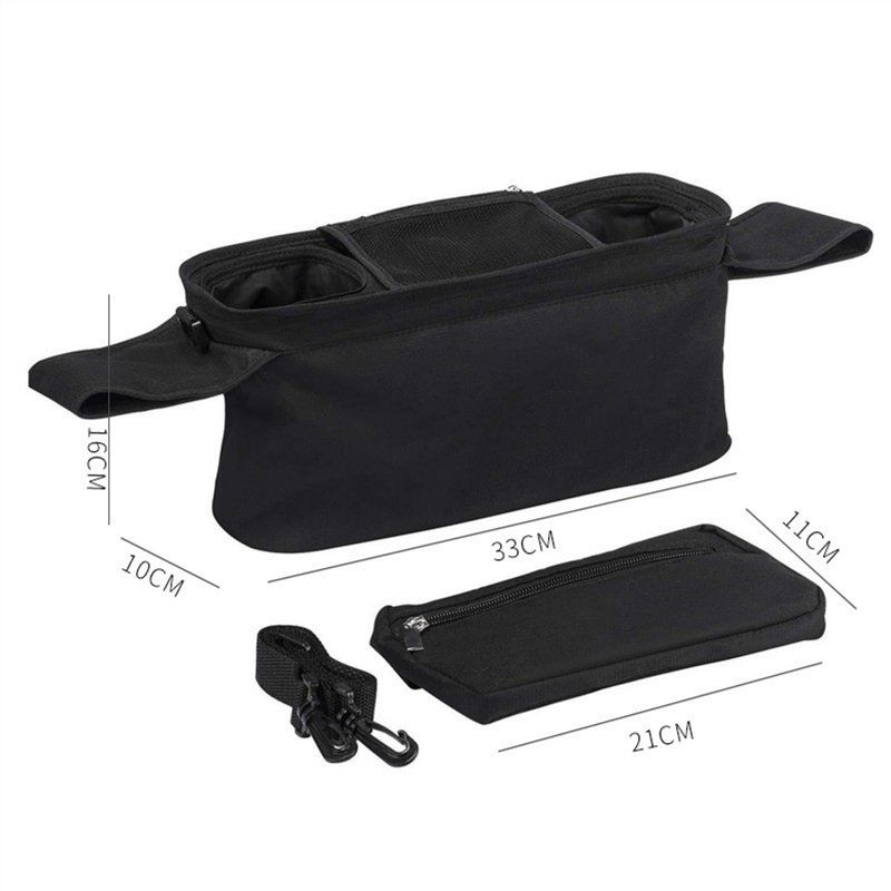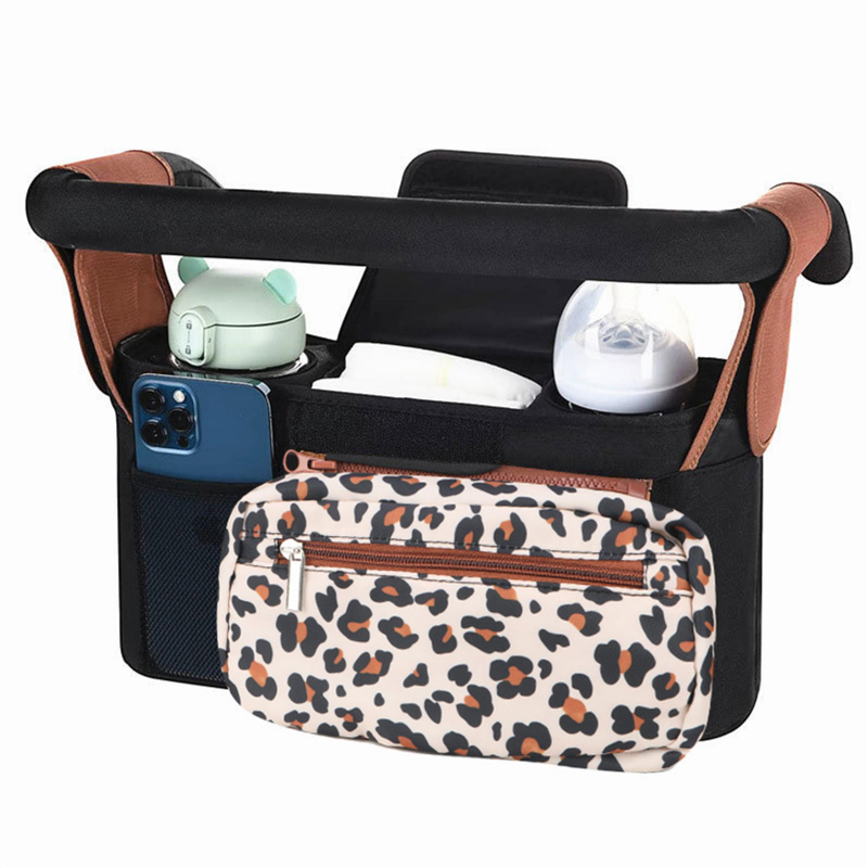 The material of this storage bag is Oxford cloth. Durable and sturdy. Can be hung on a baby stroller. Divided design for convenient storage of mobile phones, water bottles, and other personal items. Can customize your logo.