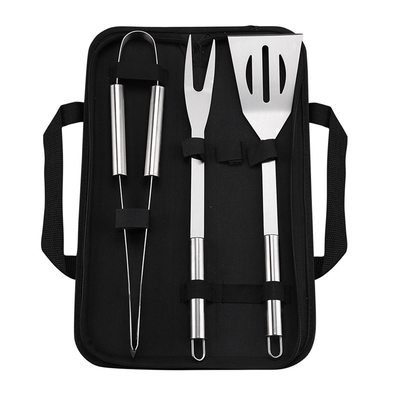 This BBQ set contain 3 tools, they are a stainless steel spatula, fork, and tongs. All tools packed in a oxford bag, which is very convenient for carry. Can customize your logo on it.