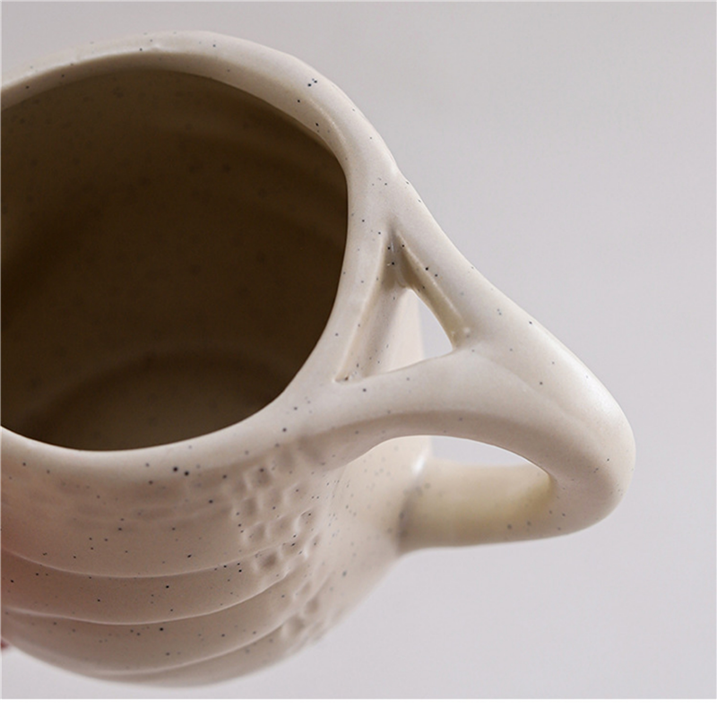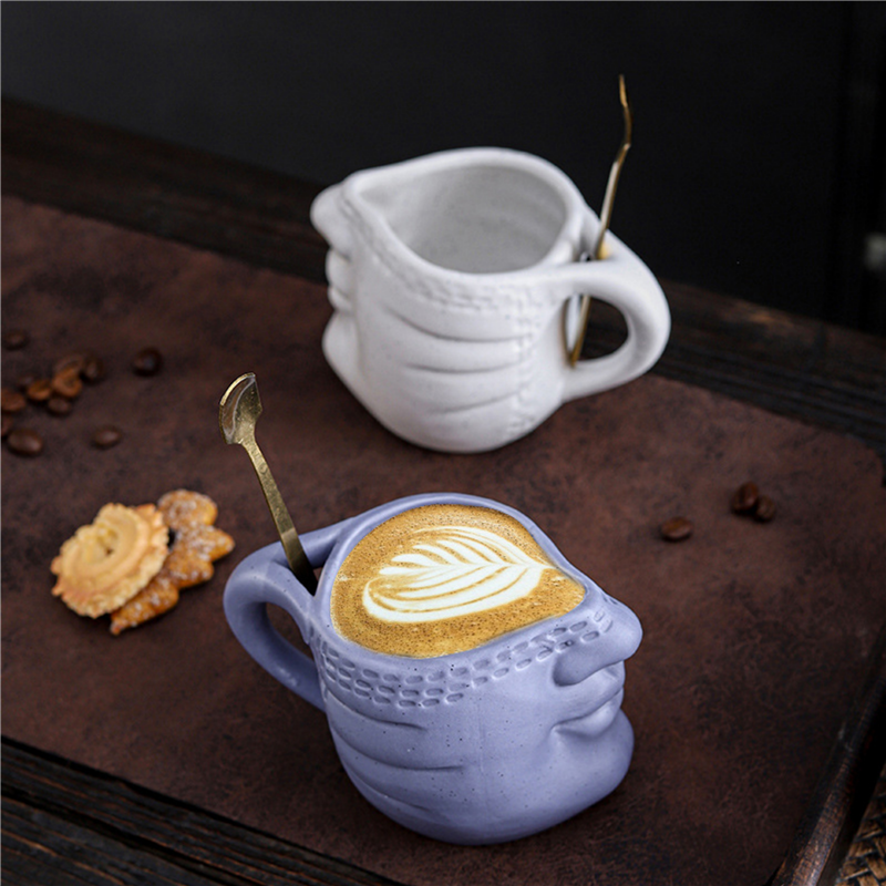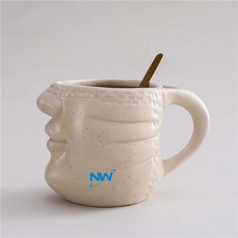The material of this cup is ceramic. Comes with a spoon. It can be filled with coffee, juice, milk, etc. This is a very practical daily water cup. Unique facial features make your life more interesting. Can customize your logo and pattern.