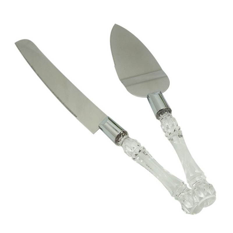 Made of Stainless Steel. Wedding Cake server Set. Set Includes an 13 inch Knife and a 10 3/4 inch Server. Handles made of high quality, clear plastic with cut crystal look. Faux crystal handles measure 4 inches long. Set makes a great gift and keepsake item.