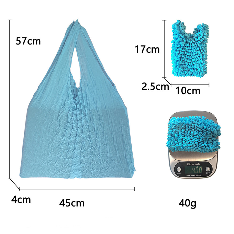 The material of this bag is polyester. It is a telescopic bag. The size before unfolding is 6.7 "* 3.9". Easy to carry. The size after unfolding is 20.5 "* 15.3" * 1.2 ". It has a large capacity and multiple colors for you to choose from. Can customize your logo and pattern.