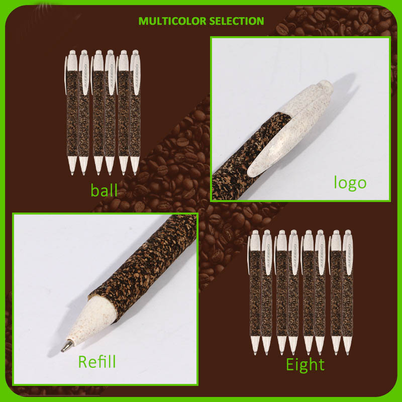 Embrace eco-conscious writing with the Eco-friendly Coffee Groudns Pen, a sustainable and stylish writing instrument crafted from recycled materials. Made of coffee grounds. Push-down closure for secure and convenient use. Smooth ballpoint tip for effortless writing. You can customize your own logo on it.