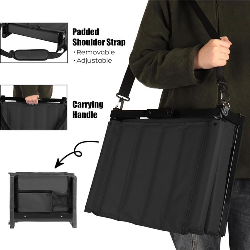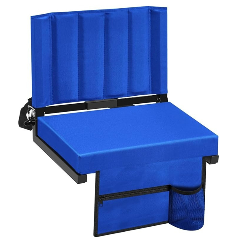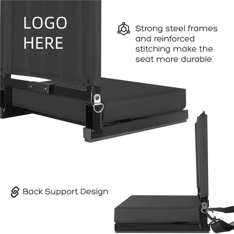 This foldable chair features a sturdy steel frame, shoulder strap, pockets for water bottles and snacks, and a safety hook on the bottom that secures the chair to bleachers. Equipped with thick seat padding. Can customize your logo on the backrest.