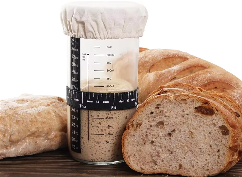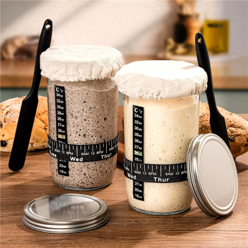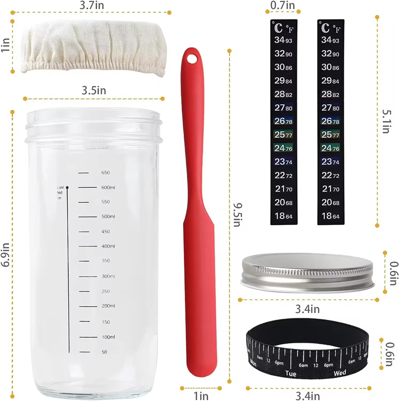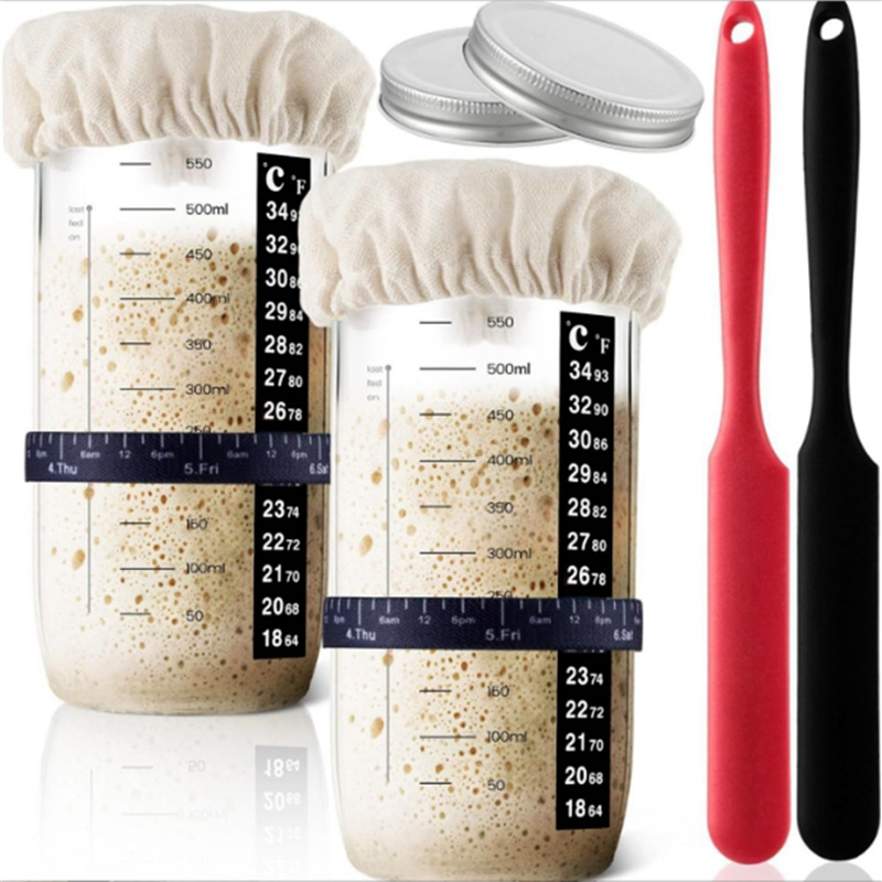 This Mason jar is made of glass and the set comes with a silicone spatula, graduated scale, and aluminum lid. The jar can be used for fermentation and also for storing food. You can customize the jar with your own logo.