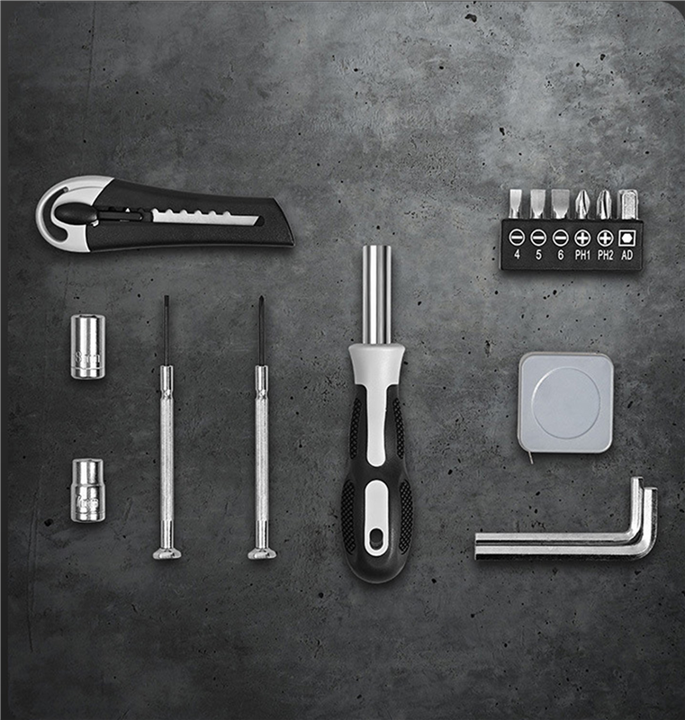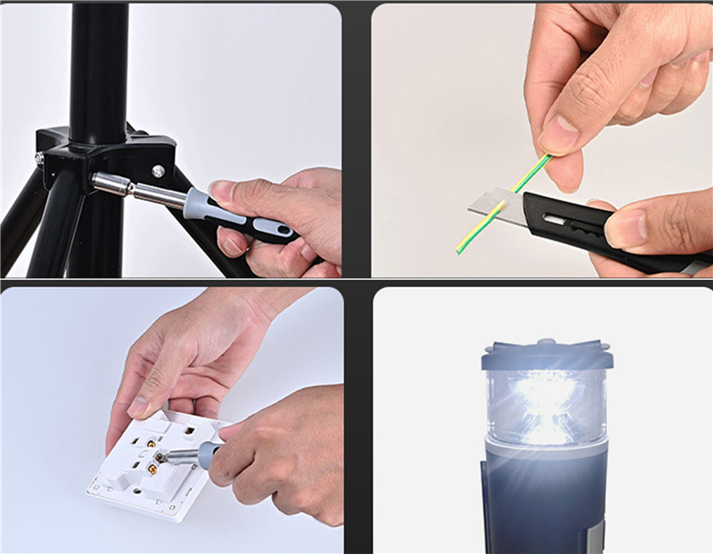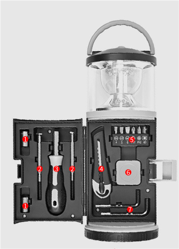 This camping lantern features a cylinder design with a high-strength case that is sturdy and drop-resistant. Included tool set, one wrench, six capes, two hex sockets, two screwdrivers, one hobby knife, one tape measure, two hex wrenches, suitable for a variety of outdoor scenarios. Built-in card slot with recessed design, tools would be neatly placed and not scattered. You can also customize your own logo.