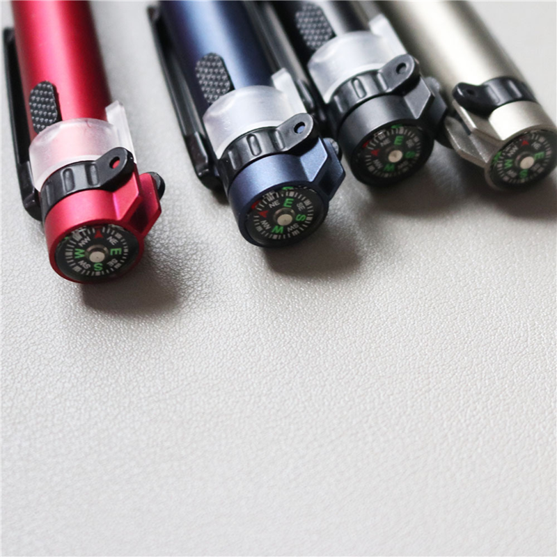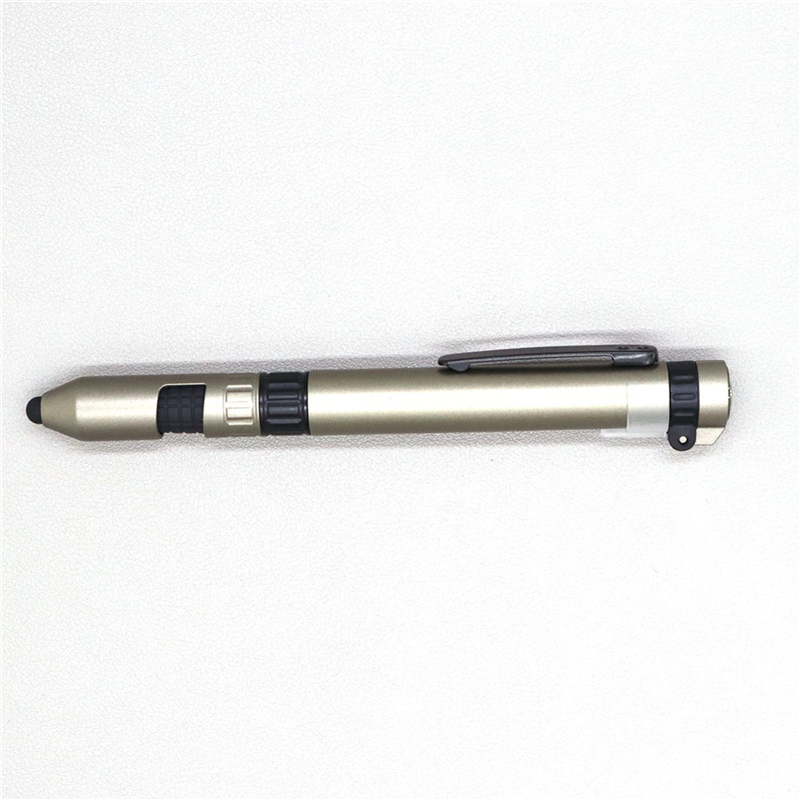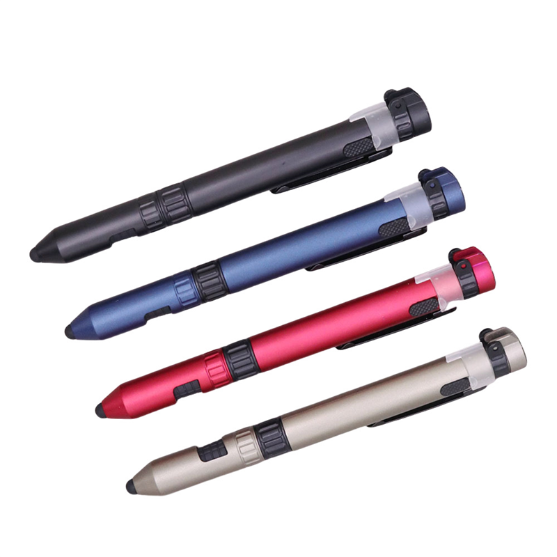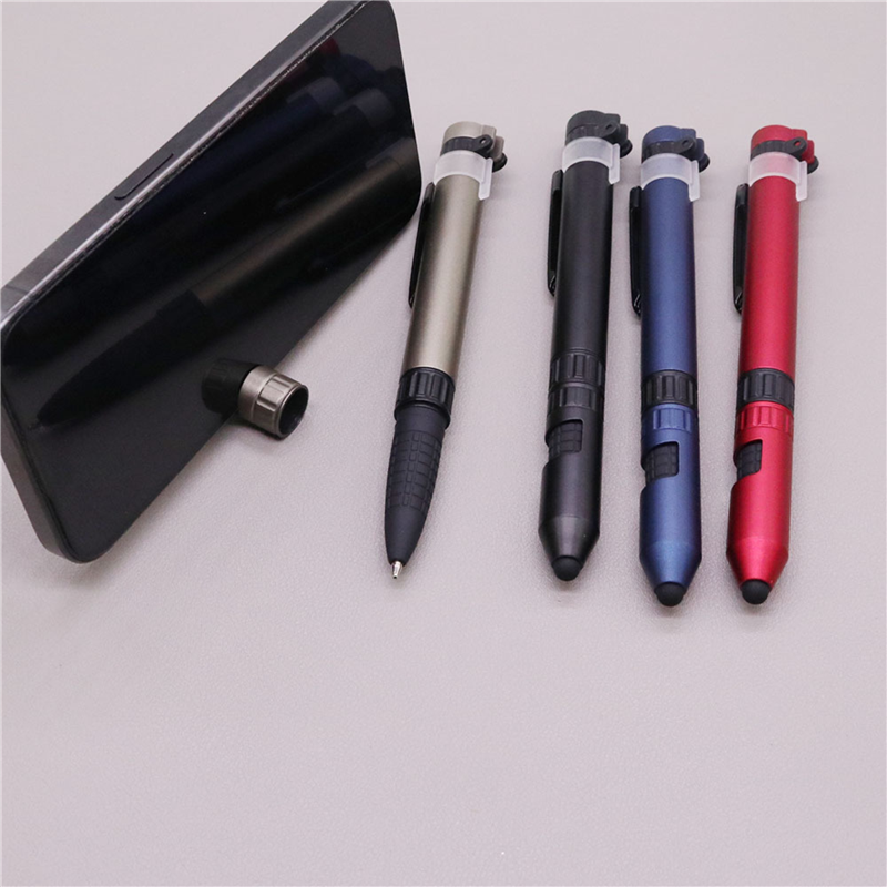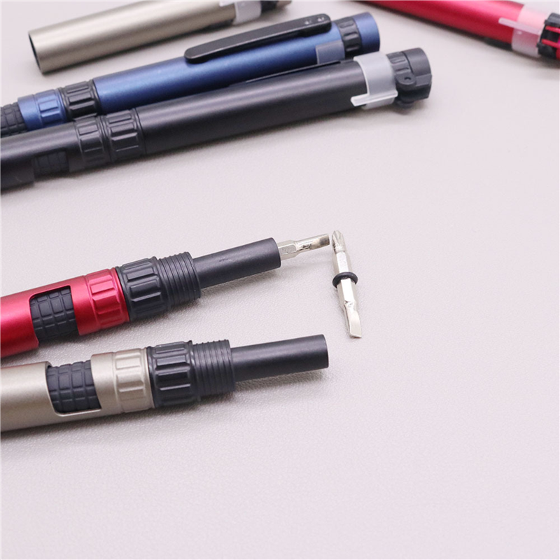 This tool pen is versatile. Contains screwdriver, 1 flat head, 1 Phillips head, super bright white LED light. Unscrew the cap for a ballpoint pen that writes comfortably and is easy to control. There is also a stylus attached to the cap. Holds all sizes of cell phones for easy viewing. Compass on top. You can customize your own logo.