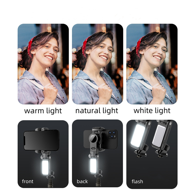 Made of high-quality aluminum alloy to ensure durability and stability. Equipped with extended tripod legs and umbrella-like skeleton structure, as well as upgraded four-point support, metal ribs and aluminum alloy telescopic rod, it ensures excellent stability even during video recording. You can use it for a close self-photography or extend it to get a larger scenery. Equipped with a fill light of 3 color modes adjustment. What's more, you will be using it as a desktop phone holder, doing live internet broadcasts, binge-watching TV shows, etc.