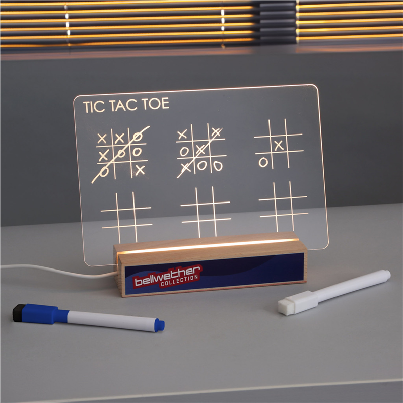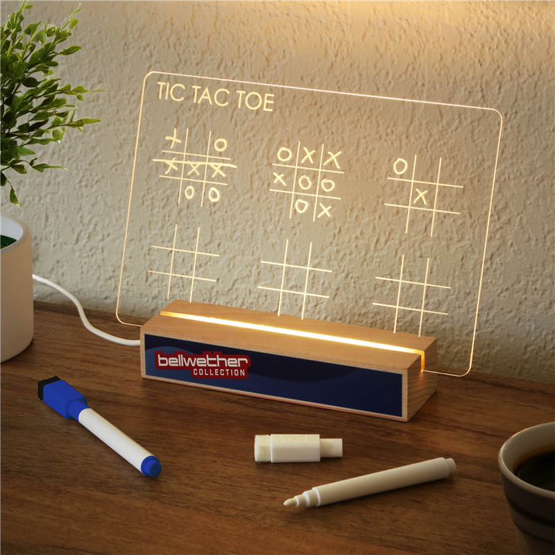 The desktop light up set includes an acrylic board, two markers, and a base with a built-in light, all crafted to enhance your enjoyment. Made from beech wood, the base adds a touch of eco-friendly elegance to your workspace. It is suitable for various situations, such as office writing, tic-tac-toe games etc. You can customize your logo on the base.