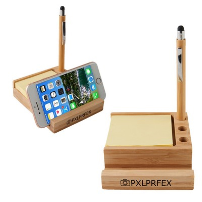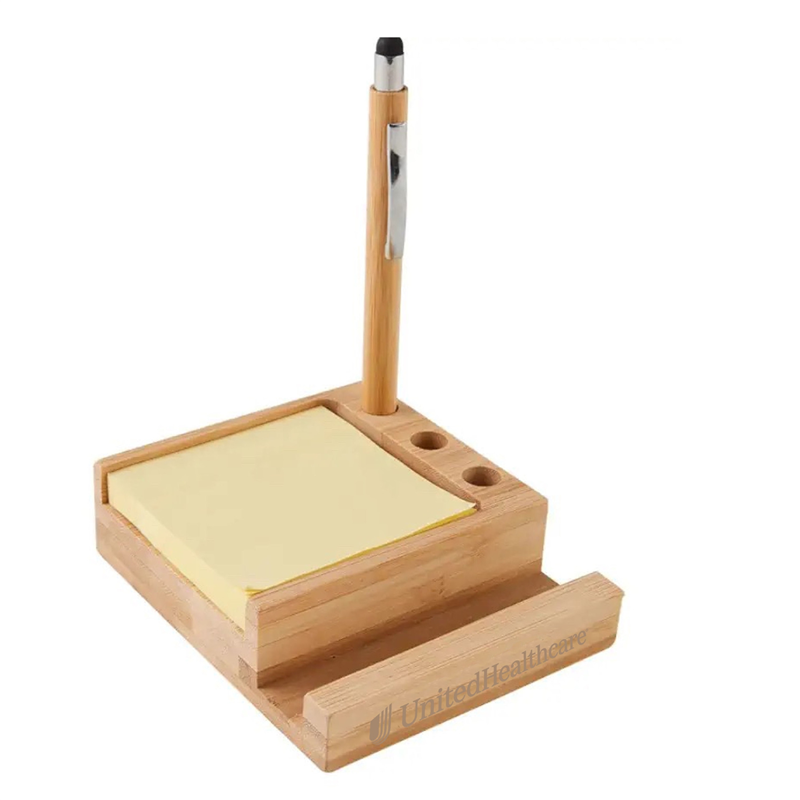 This desk organizer features a bamboo phone stand and 3 pen slots. It can hold a 3" x 3" sticky note pad & three pens. You can customize your logo on the base.