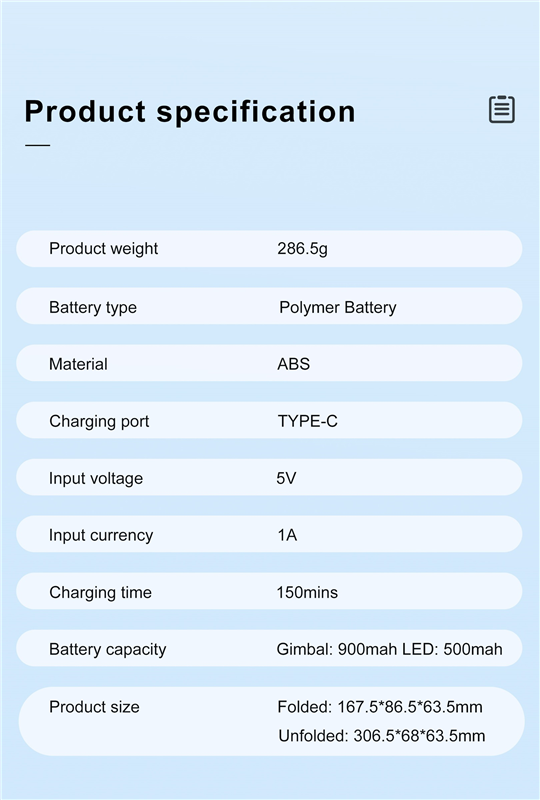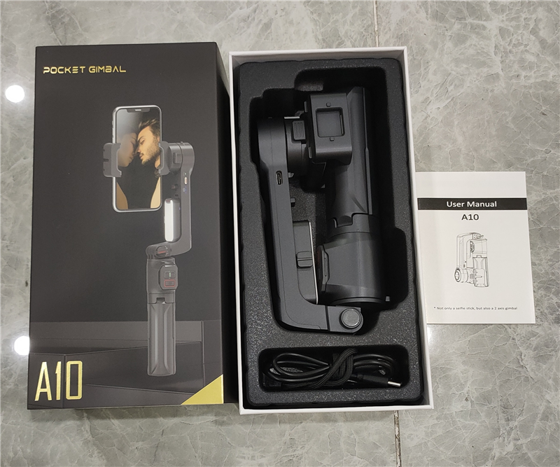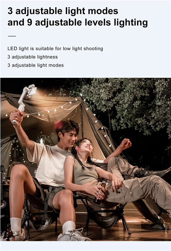 This is a 2-axis multifunctional handheld gimbal, with the built-in extension rod length up to 15.5 inches to help you find more shooting angles. LED light provides 3 adjustable light modes and 9 adjustable levels lighting. Please refer to the pics to know more about its parameters. No companion app. Custom logo is available.