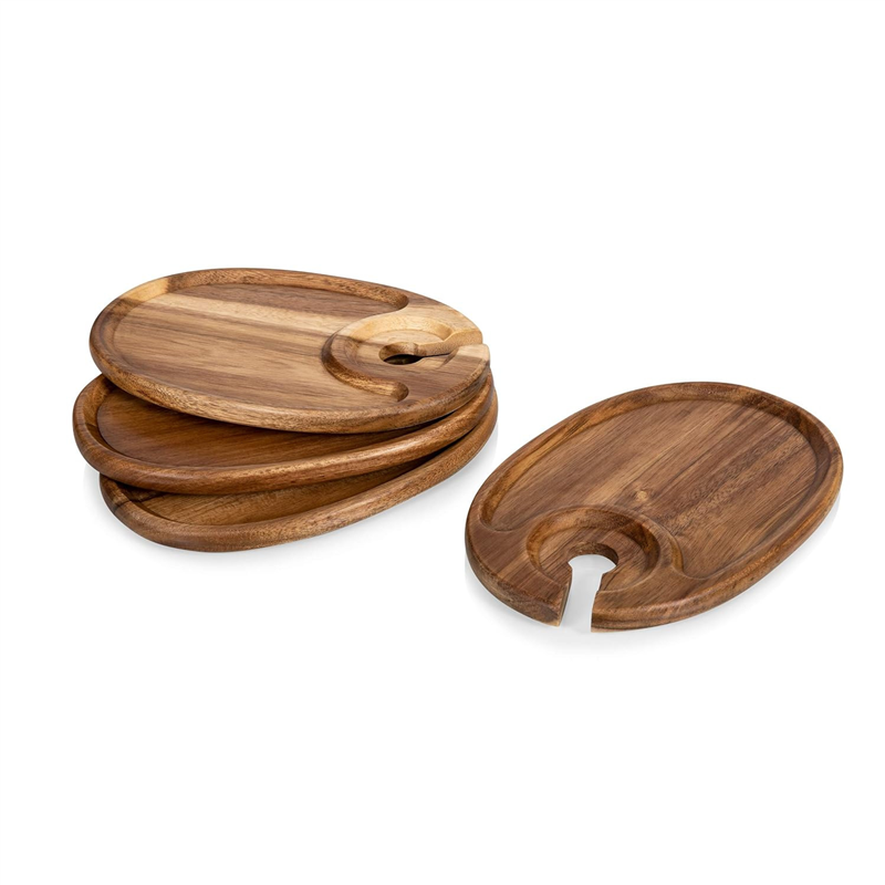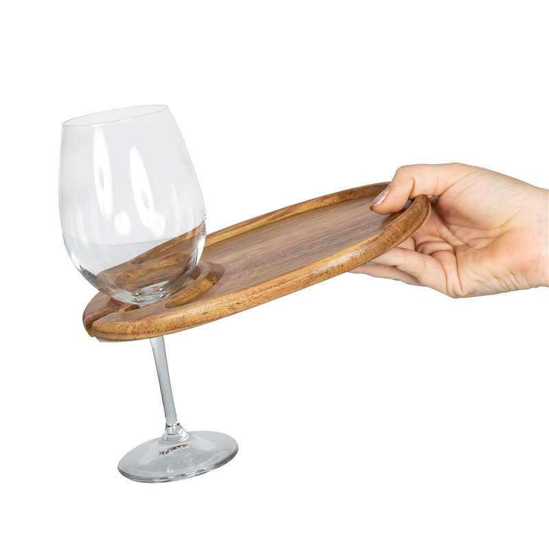 This unique wine taster tray will make your party a hit, which has a recessed pocket for small snack foods like cheese, crackers, pudding, grapes, etc..... The precision milled wine glass holder allows your guests to interact with confidence. Add your laser engraved logo, your branding for a memorable event.
