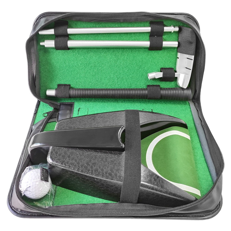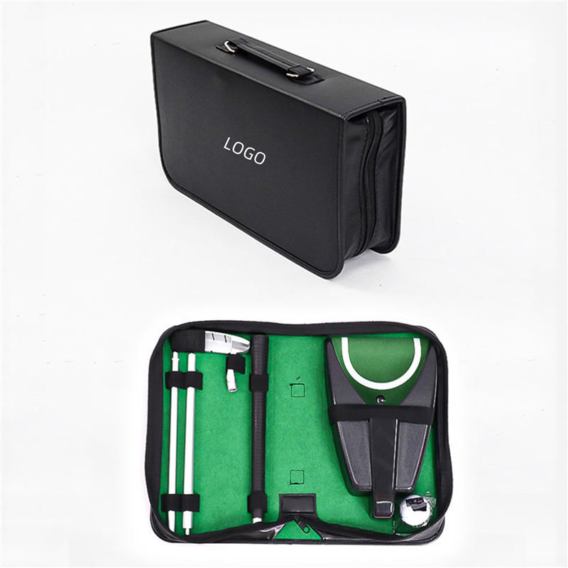 This portable executive putter set lets you take a club and golf ball on the go! Comes in a zipper bag. Includes a ball return cup, a screw together golf club, and a golf ball. Perfect your swing while travelling! Custom logo on the bag is available.