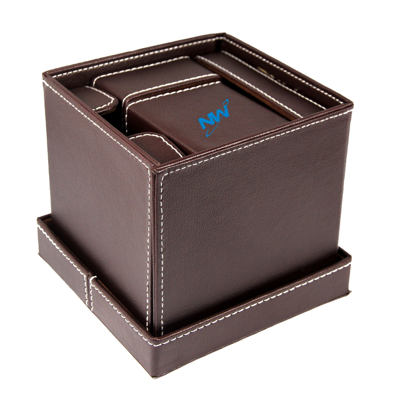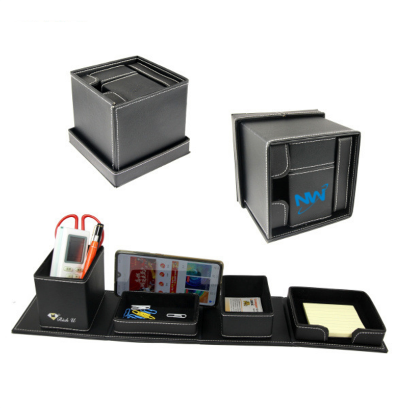 The material of this product is PU. It is a multifunctional and foldable desktop storage box. We can customize the logo according to your requirements. It helps you keep your desktop tidy. High quality.