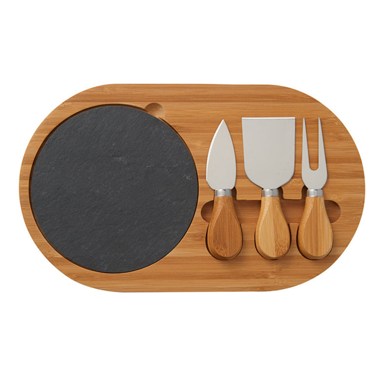 This set includes a Bamboo Tray, Removable Slate Serving Block, Cheese Fork, Spade, and Flat Knife. Bamboo is an eco friendly 100% renewable resource and naturally heat and bacteria resistant. Hand washing recommended. Perfect for picnics, small gatherings with friends & parties. Due to natural variations in the grain, laser engraved imprints may have slightly different shades.