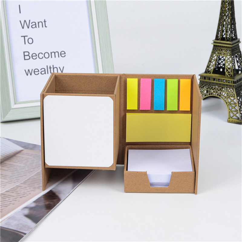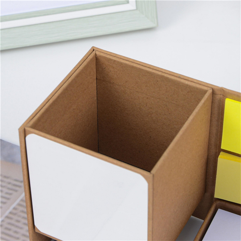 The material of this storage box is kraft paper. There are four types of sticky notes on the box. It is both a notepad and a storage box. Can customize your logo and pattern.