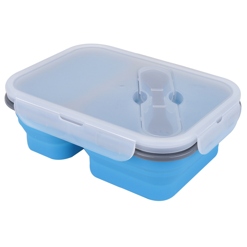 Compact lunch box with built-in fork/spoon utensil and divided compartments. Features soft-touch silicone base that collapses for easy storage and travel.