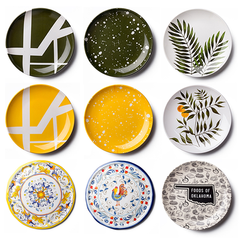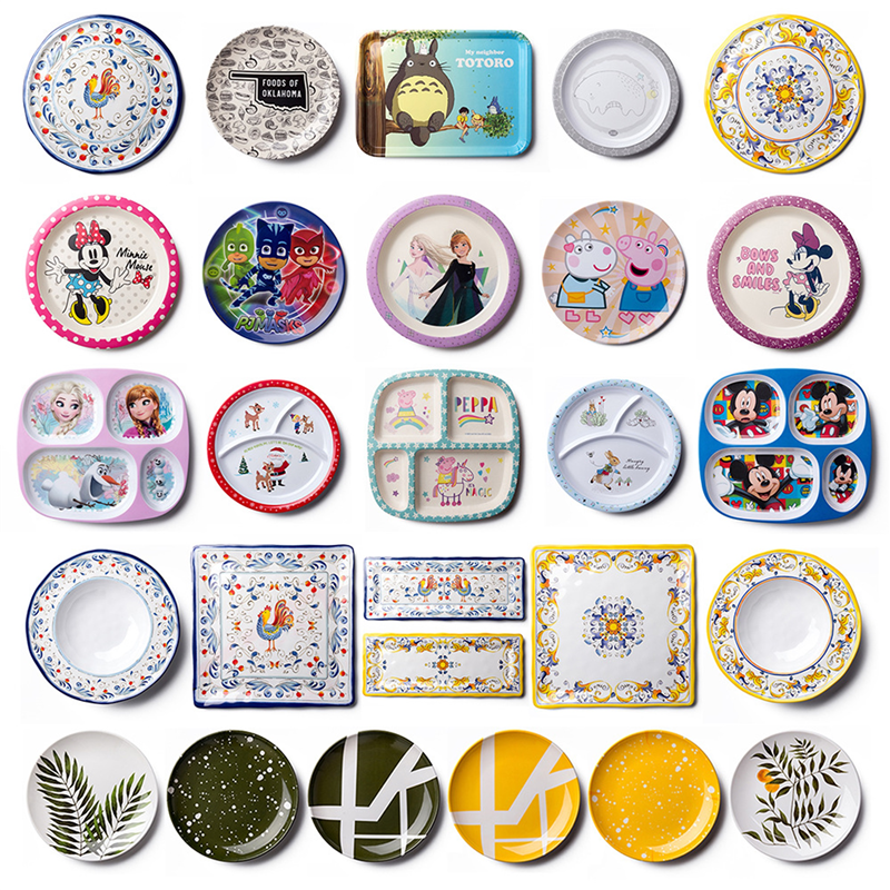 Made of food grade melamine, these dinner plates are flat with a low rim, easily stackable for cupboard space efficiency. Custom full color logo is available. Welcome inquiry for various custom melamine tablewares!