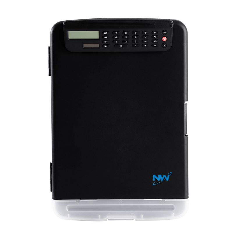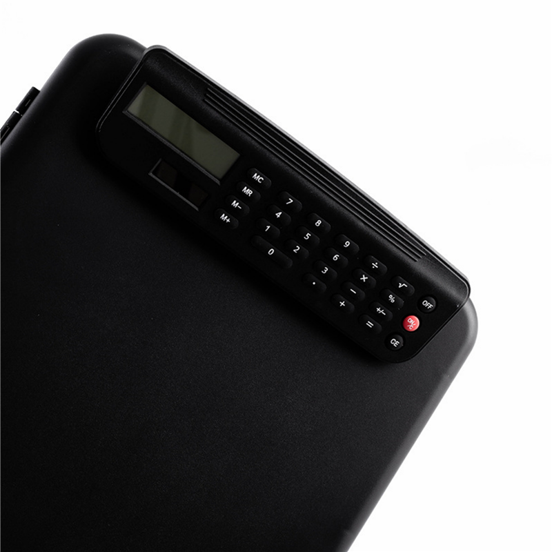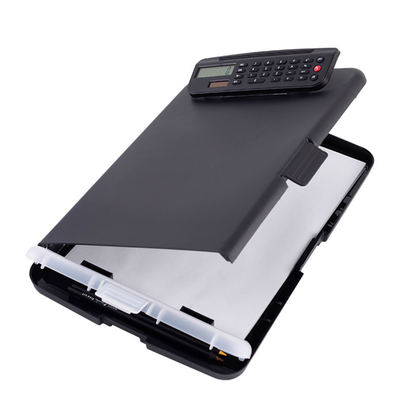 The material of this clipboard is plastic. It is a multifunctional product. Bring a storage box, a calculator, and a pencil case. Can customize your logo and pattern.