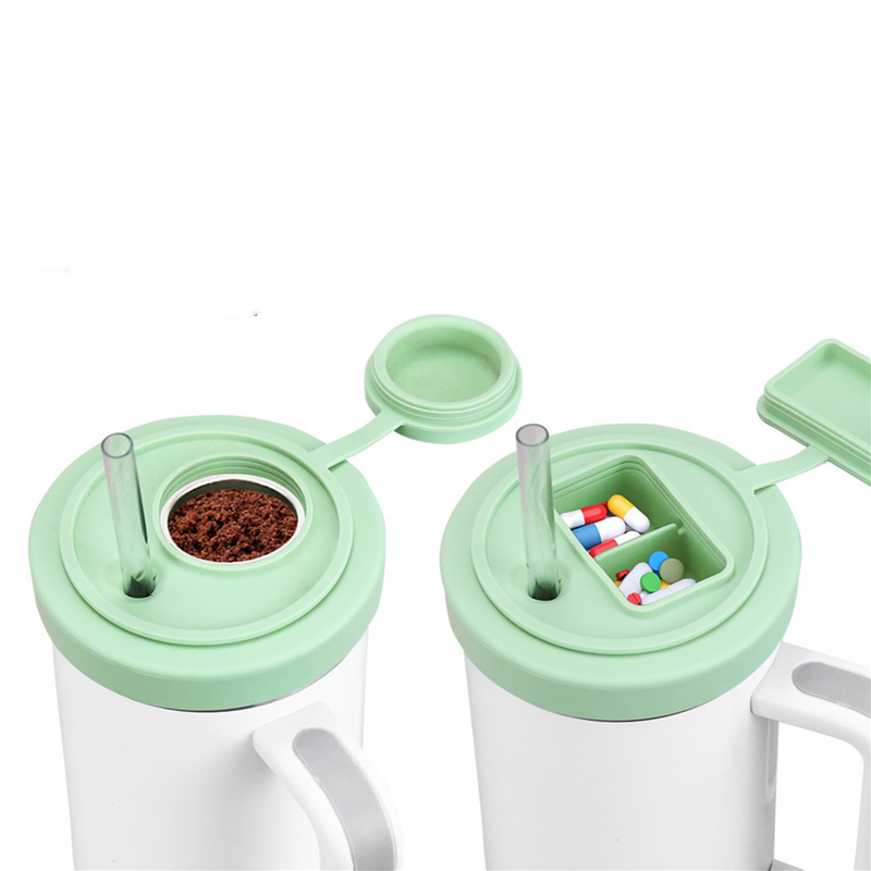 This lid is suitable for car cups. One set has two types of lids, one can hold pills. A type that can be filled with coffee powder. Can customize your logo and pattern.