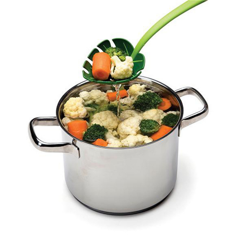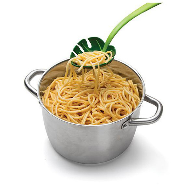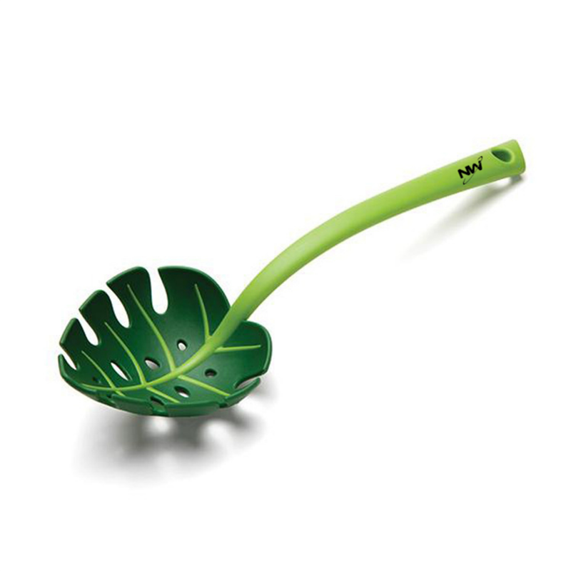 The material of this spoon is plastic. It won't harm your pot and is more durable than silicone. The shape of leaves adds fun to cooking. Can customize your logo and pattern.