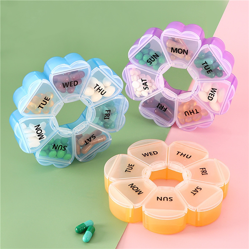 Round petal design, unique push-button switch for easier use. The clear color helps to see or search the weekly pill organizer better and remind of you the day, translucent box makes it clear whether you take your pills in time or not. Any company logo, company name can be printed on it. Welcome your customization.