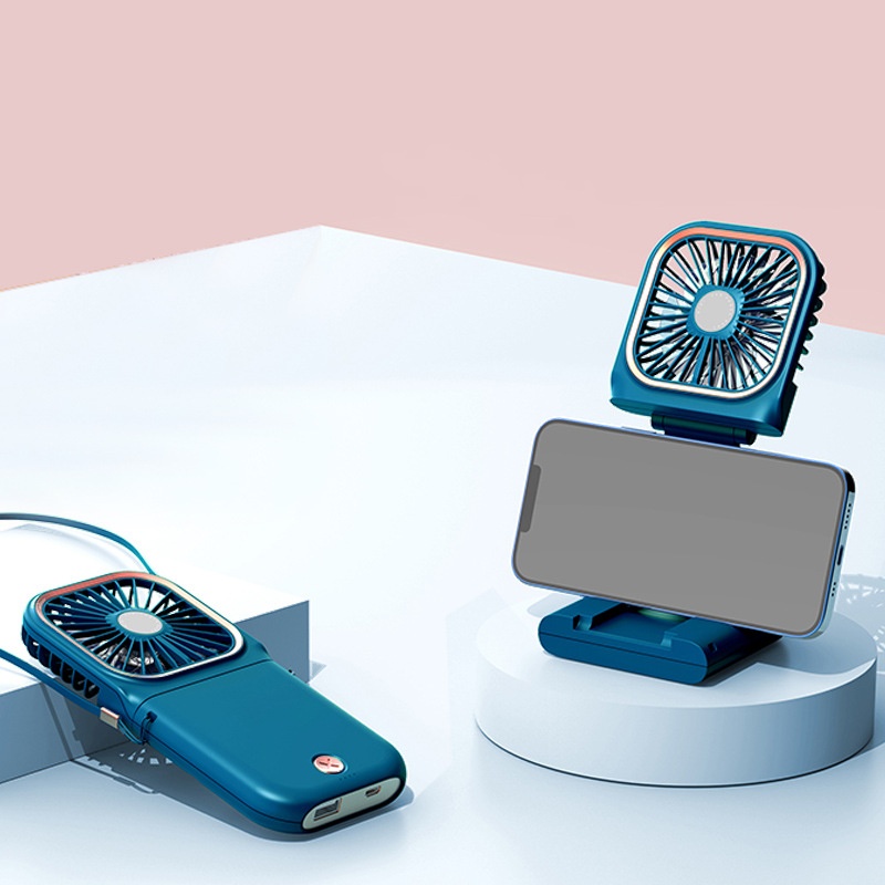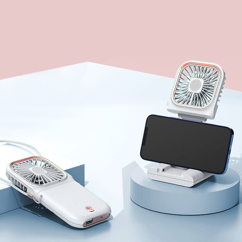 Exclusive all in 1 power fan stand features with 3 speeds control, 180 degree folding and flip design, 3000mAh built-in battery. Unique built-in phone holder design, you can use as phone stand to put it on the desk, and adjust to any direction you need. 3000 mAH rechargeable battery can use 4-6 hours without recharge, it can use it as power bank to charge your phone. Hand free design allow you to wear around you neck and enjoy the wind.