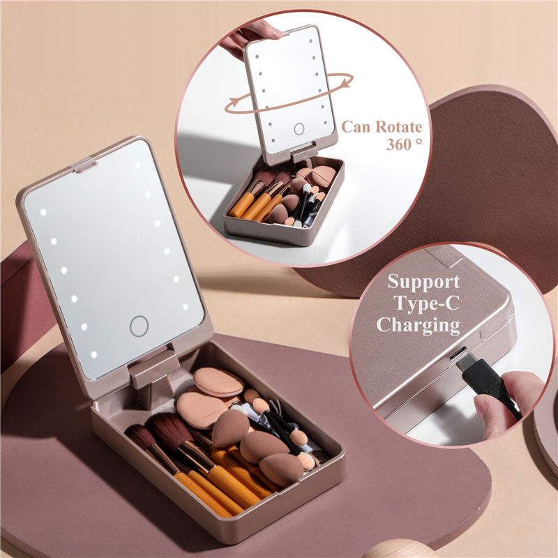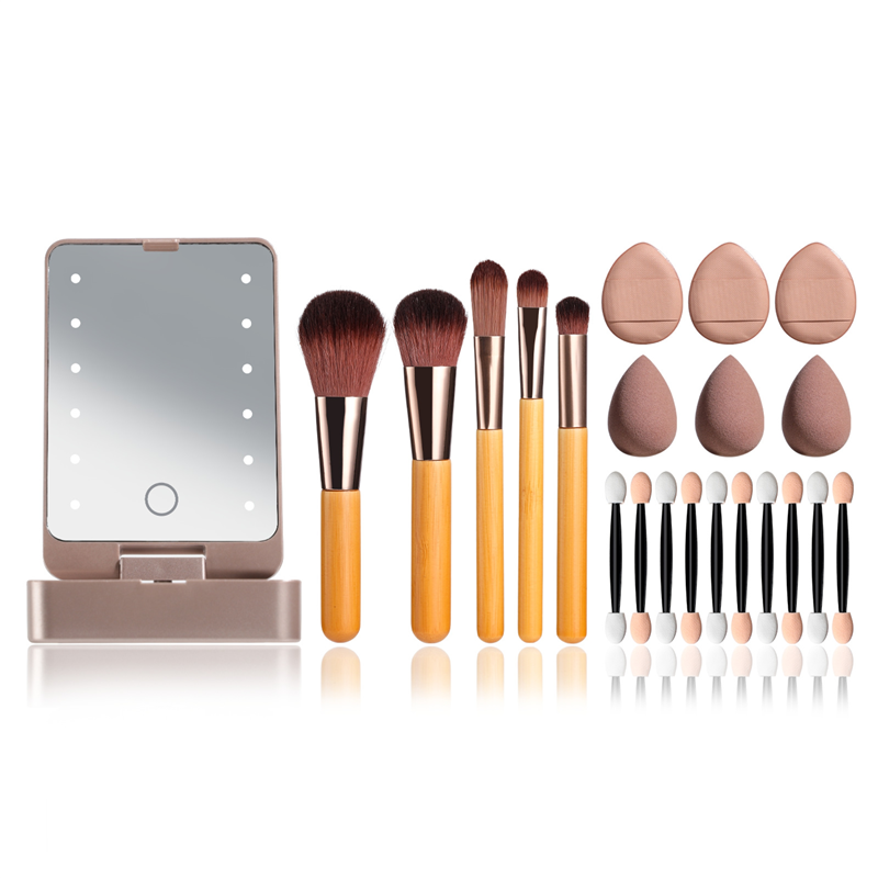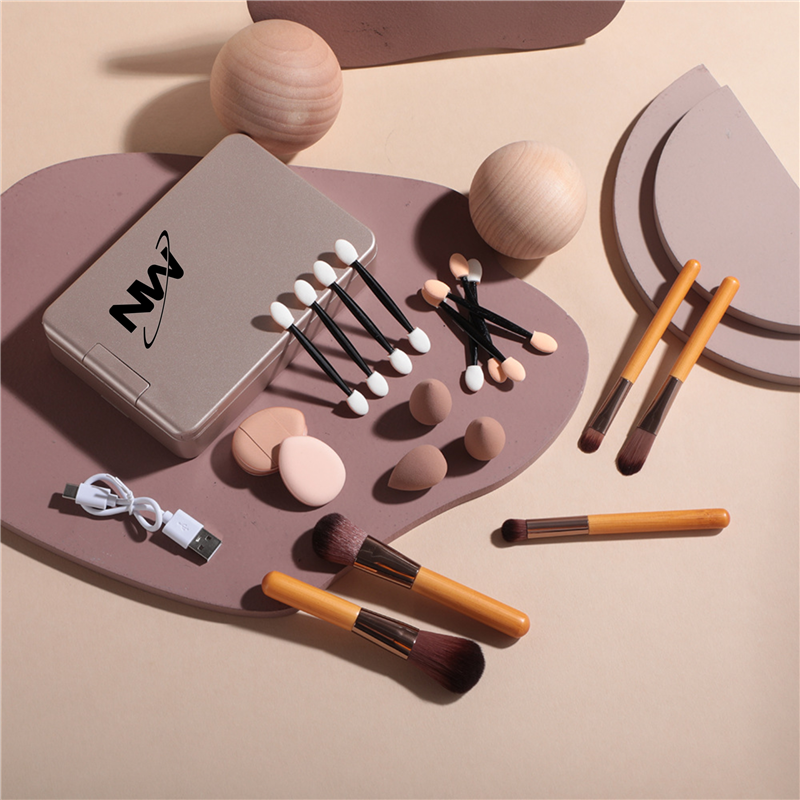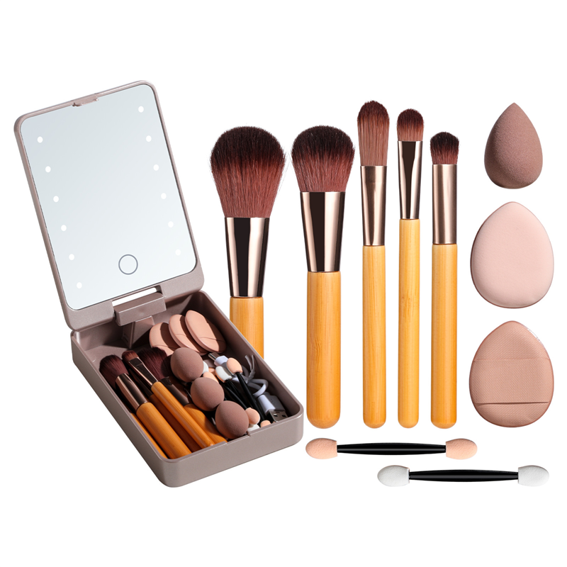 This makeup tool is a set. It includes makeup mirror, 5 makeup brushes, 3 powder puffs and 2 eye shadow brushes. It covers all the makeup tools you need to use. And bring a mirror. This mirror is illuminated. Very suitable for carrying outside. You no longer have to worry about your makeup fading. Help you touch up your makeup anytime, anywhere. Can customize your logo and pattern.