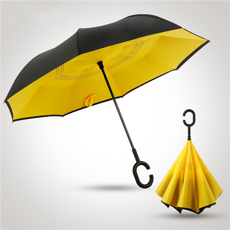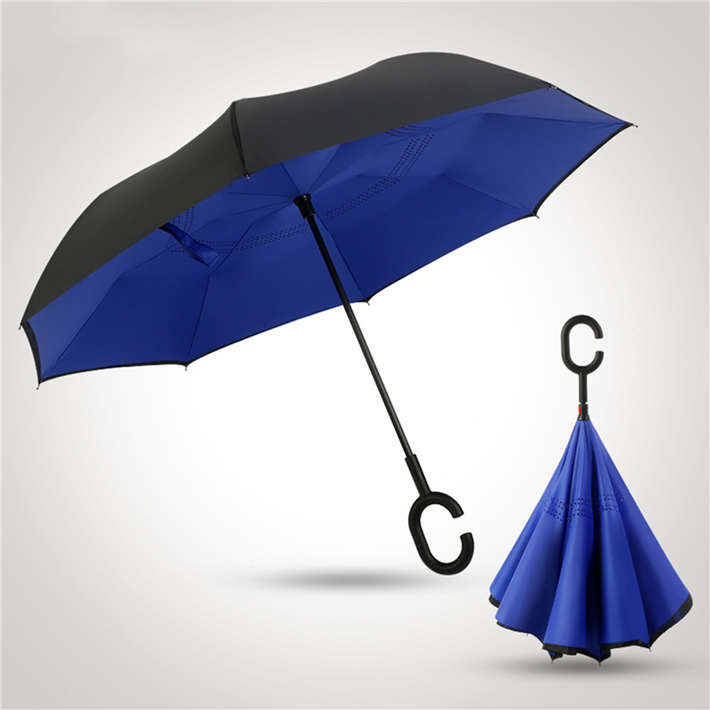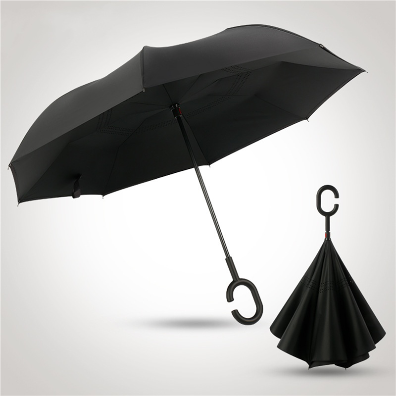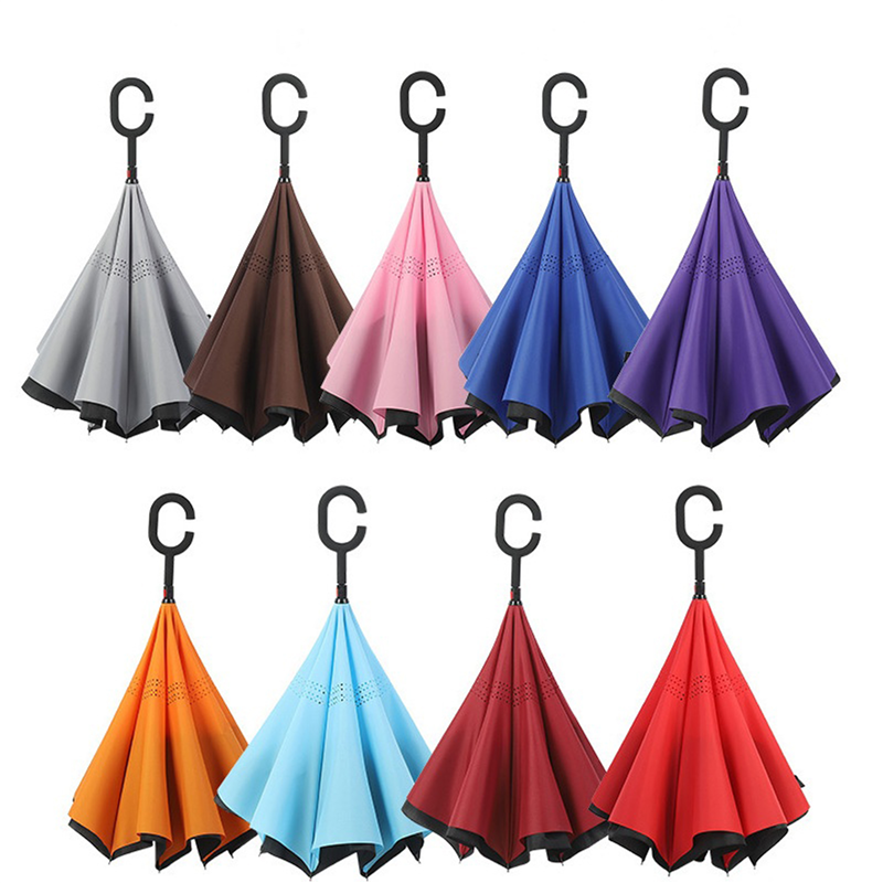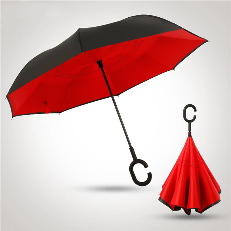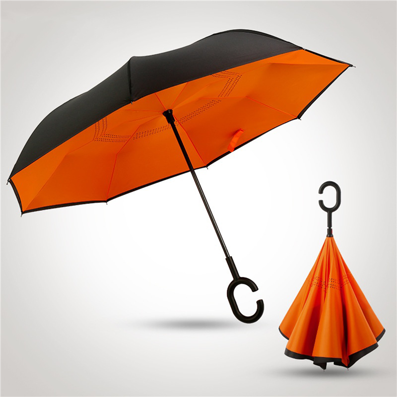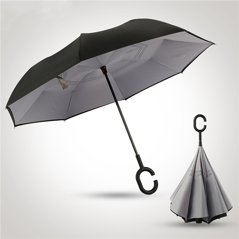 This umbrella is made of 190T pongee material. Inverted, and be suitable for car using. The C holder will leave your hands free for holding a baby or using a mobile. Can customize your logo on the umbrella.