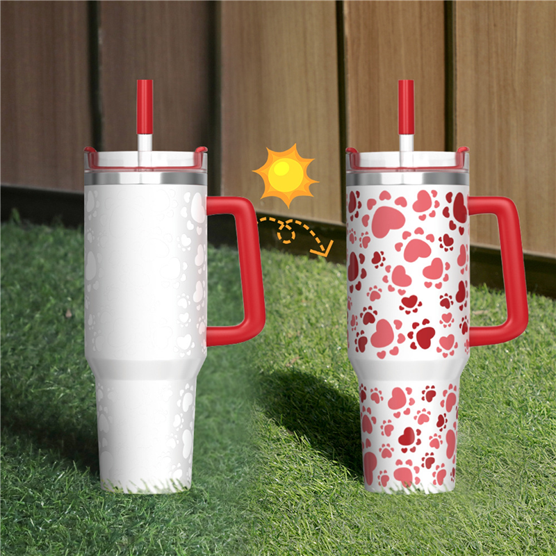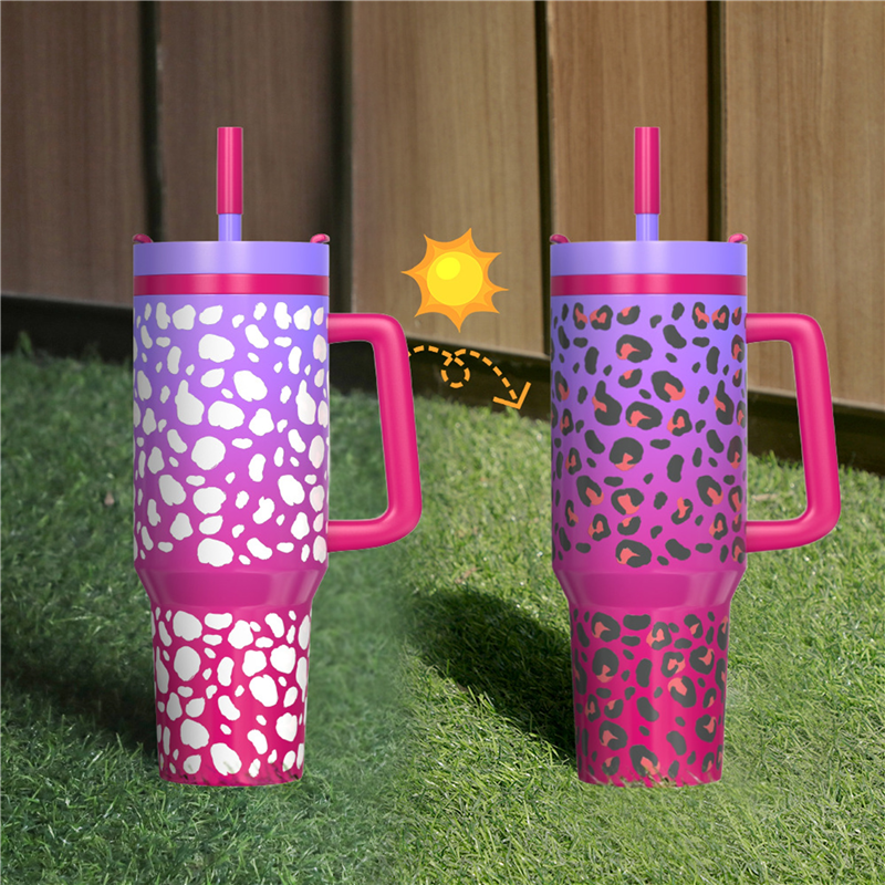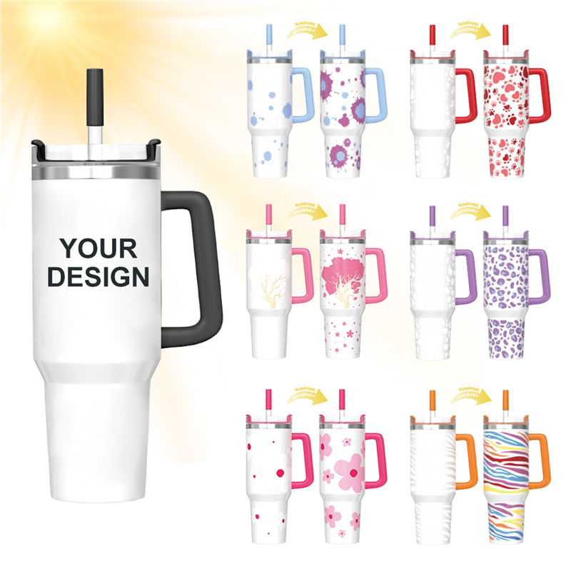 This 40oz stainless steel vacuum insulated travel mug made from SS304, can keep your drinks hot or cold for hours. The exterior patterns can be customized and it can change from one pattern to the other under sunshine.