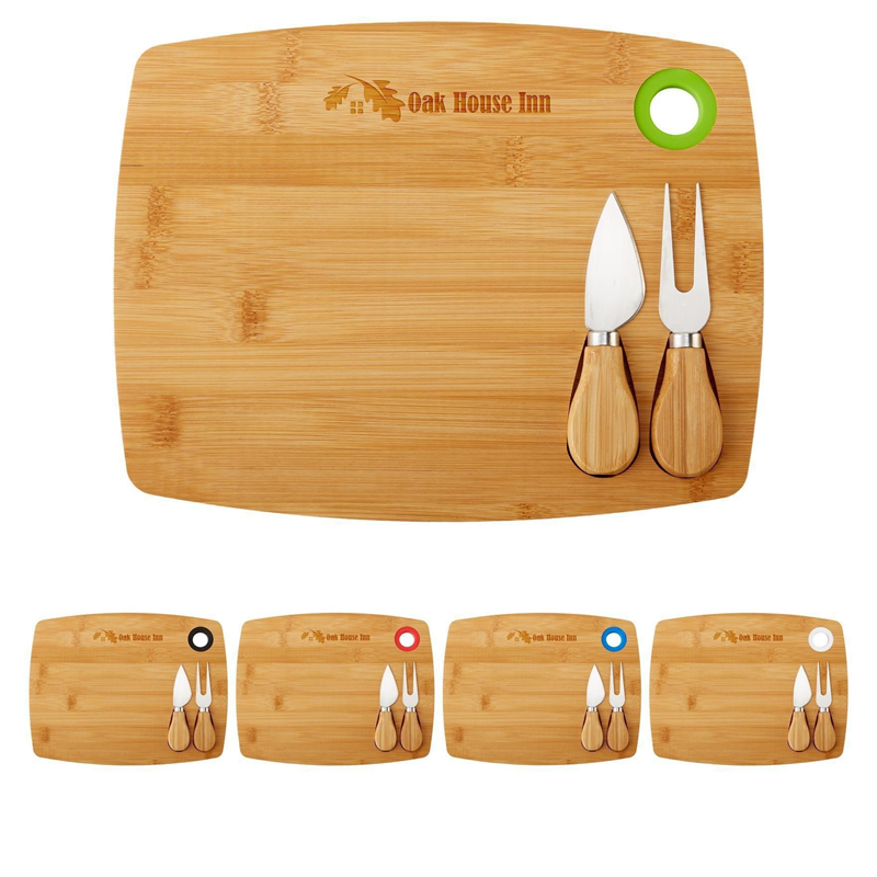 This 3 piece bamboo cheese board set includes: Bamboo Wood cutting board, Cheese Fork, and Spade. Features a silicone accent ring with naturally heat and bacteria resistant. Best to hand wash with warm water and mild soap/detergent.Due to natural variations in the grain, laser engraved imprints may have slightly different shades.