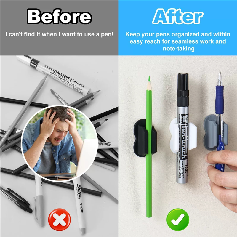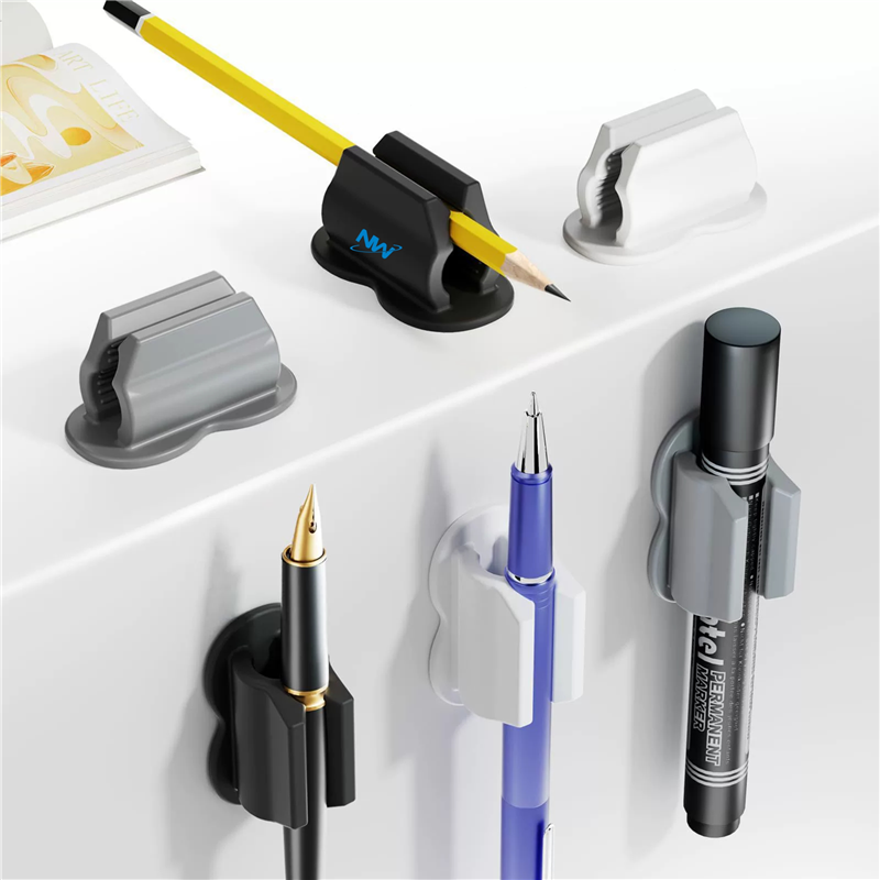 Simply securely connect the silicone pen holder to your desk, computer monitor, bulletin board, desktop, mirror, clipboard, furniture, car, whiteboard, or any smooth surface. Made of high-quality silicone, durable, flexible, and wear-resistant, ensuring long-term use. Each desktop pen holder has a self-adhesive back that can securely attach to most non porous surfaces. Can customize your logo and pattern.